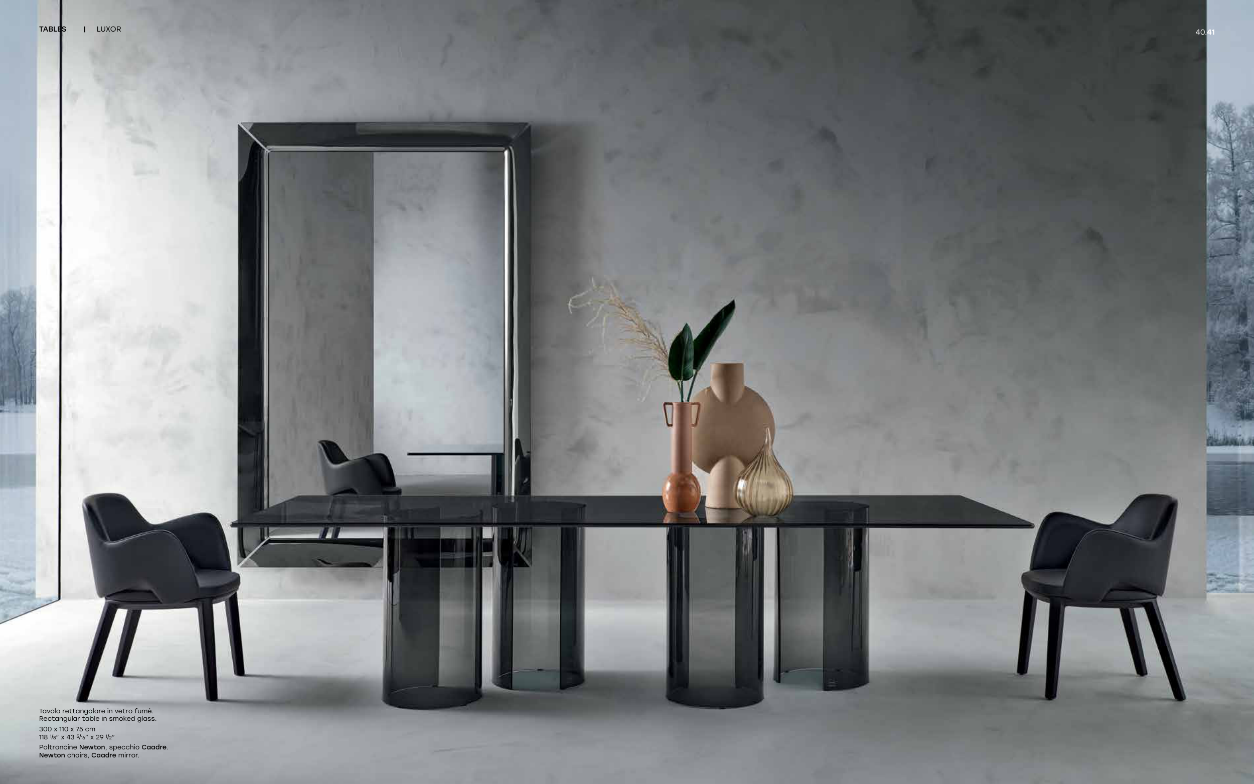 TABLES | LUXOR 40.41 Tavolo rettangolare in vetro fumè. Rectangular table in smoked glass. 300 x 110 x 75 cm 118 1/8” x 43 5/16” x 29 1/2” Poltroncine Newton, specchio Caadre. Newton chairs, Caadre mirror.