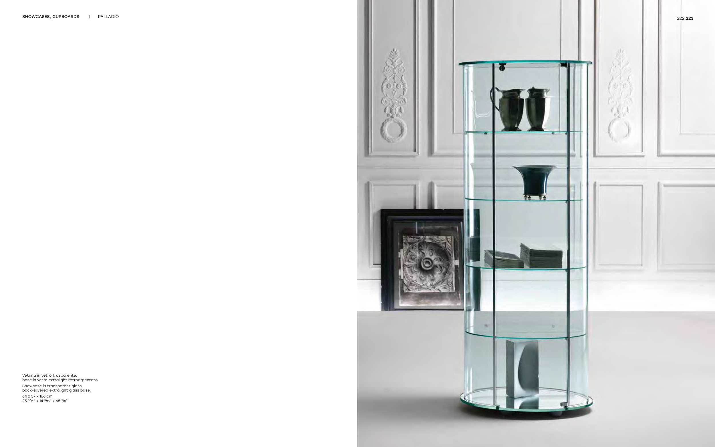 Vetrina in vetro trasparente, base in vetro extralight retroargentato. Showcase in transparent glass, back-silvered extralight glass base. 64 x 37 x 166 cm 25 3/16” x 14 9/16” x 65 3/8” 222.223 SHOWCASES, CUPBOARDS | PALLADIO