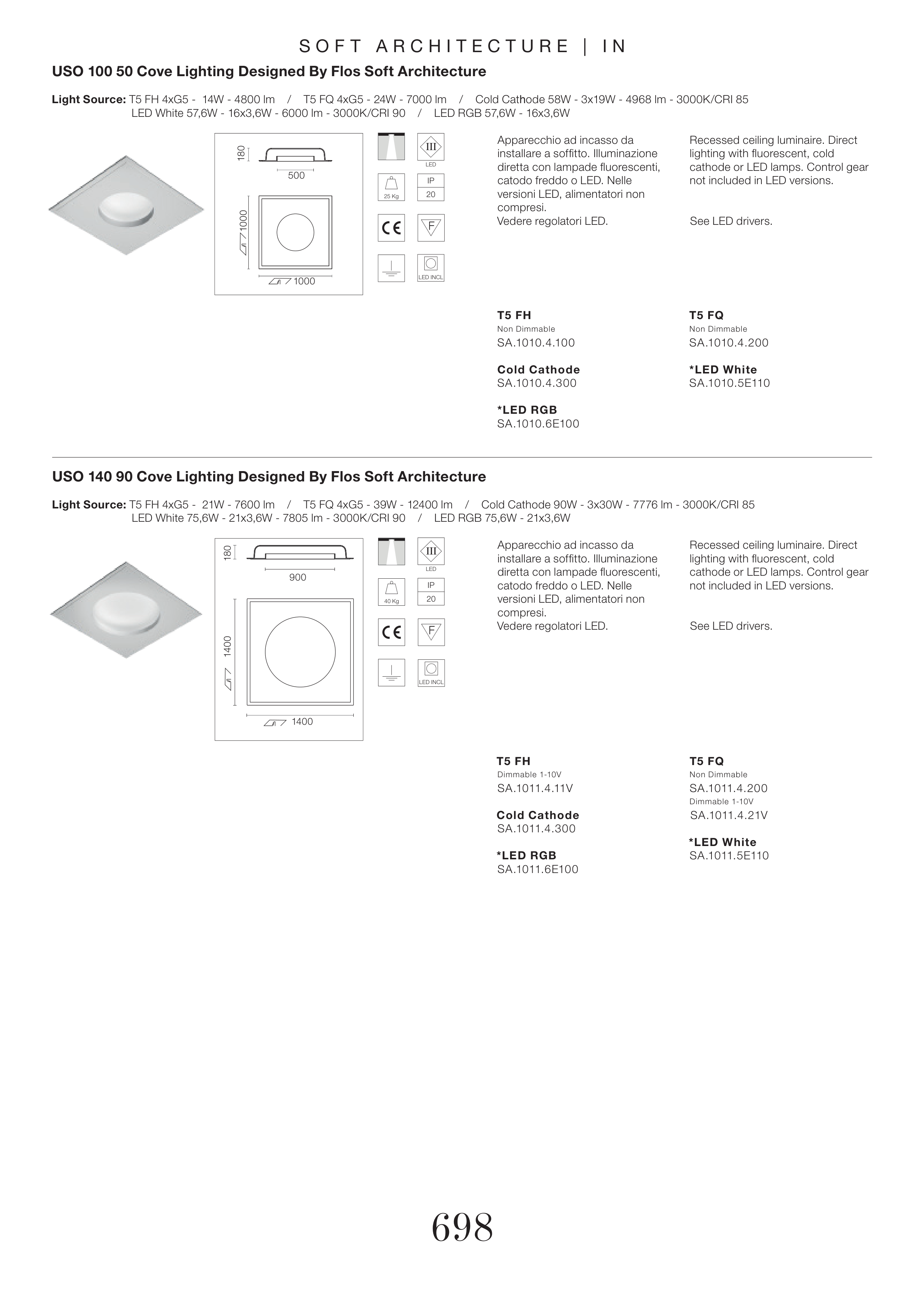 Light Source: T5 FH 4xG5 - 21W - 7600 lm / T5 FQ 4xG5 - 39W - 12400 lm / Cold Cathode 90W - 3x30W - 7776 lm - 3000K/CRI 85