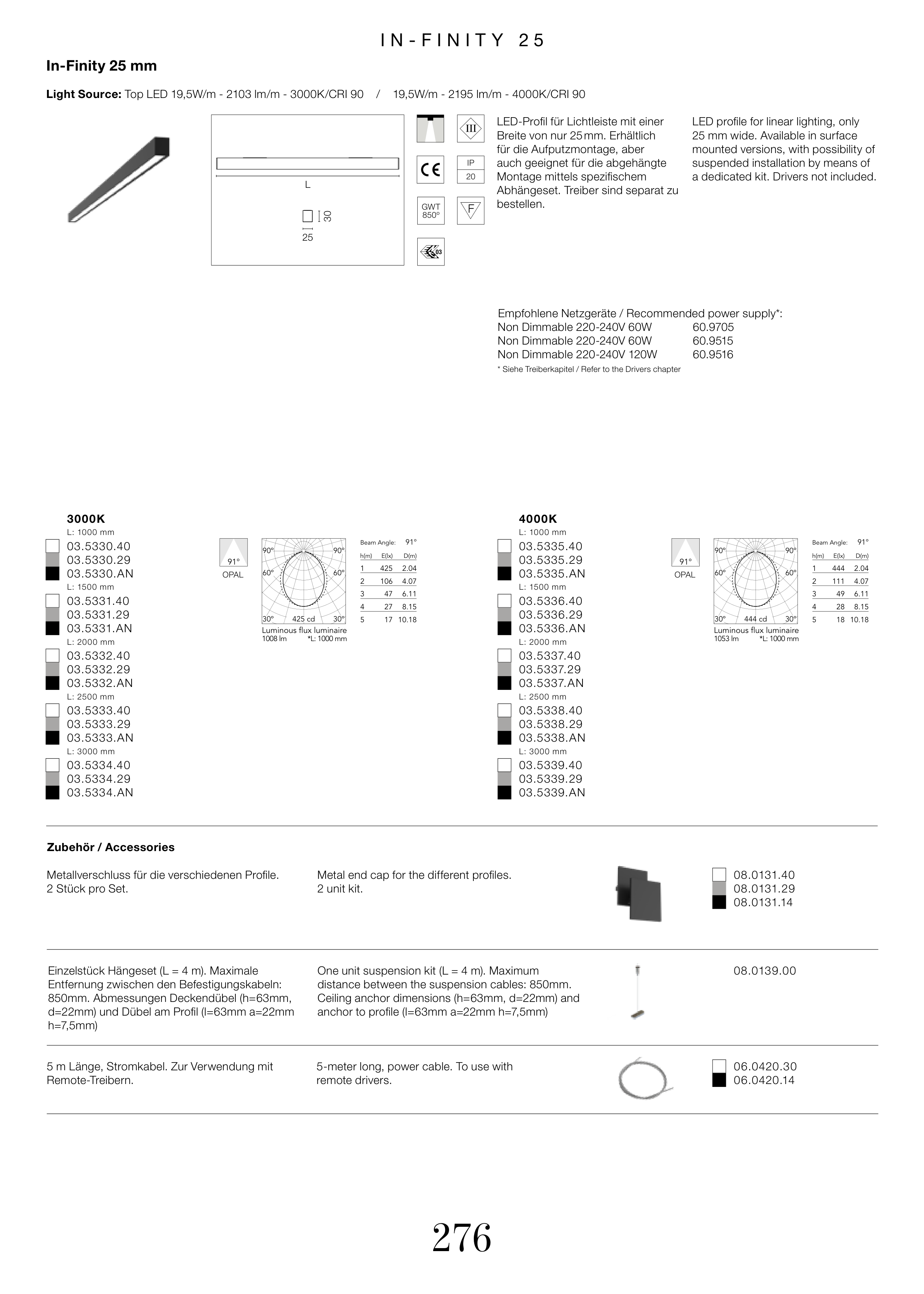 Light Source: Top LED 19,5W/m - 2103 lm/m - 3000K/CRI 90 / 19,5W/m - 2195 lm/m - 4000K/CRI 90