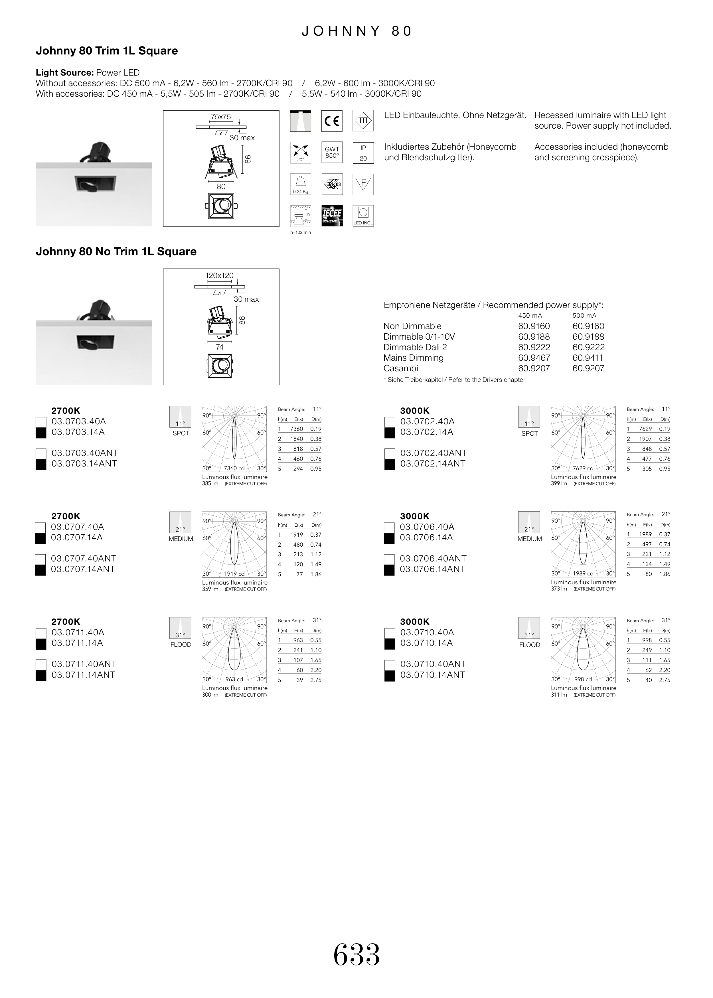 With accessories: DC 450 mA - 5,5W - 505 lm - 2700K/CRI 90 / 5,5W - 540 lm - 3000K/CRI 90