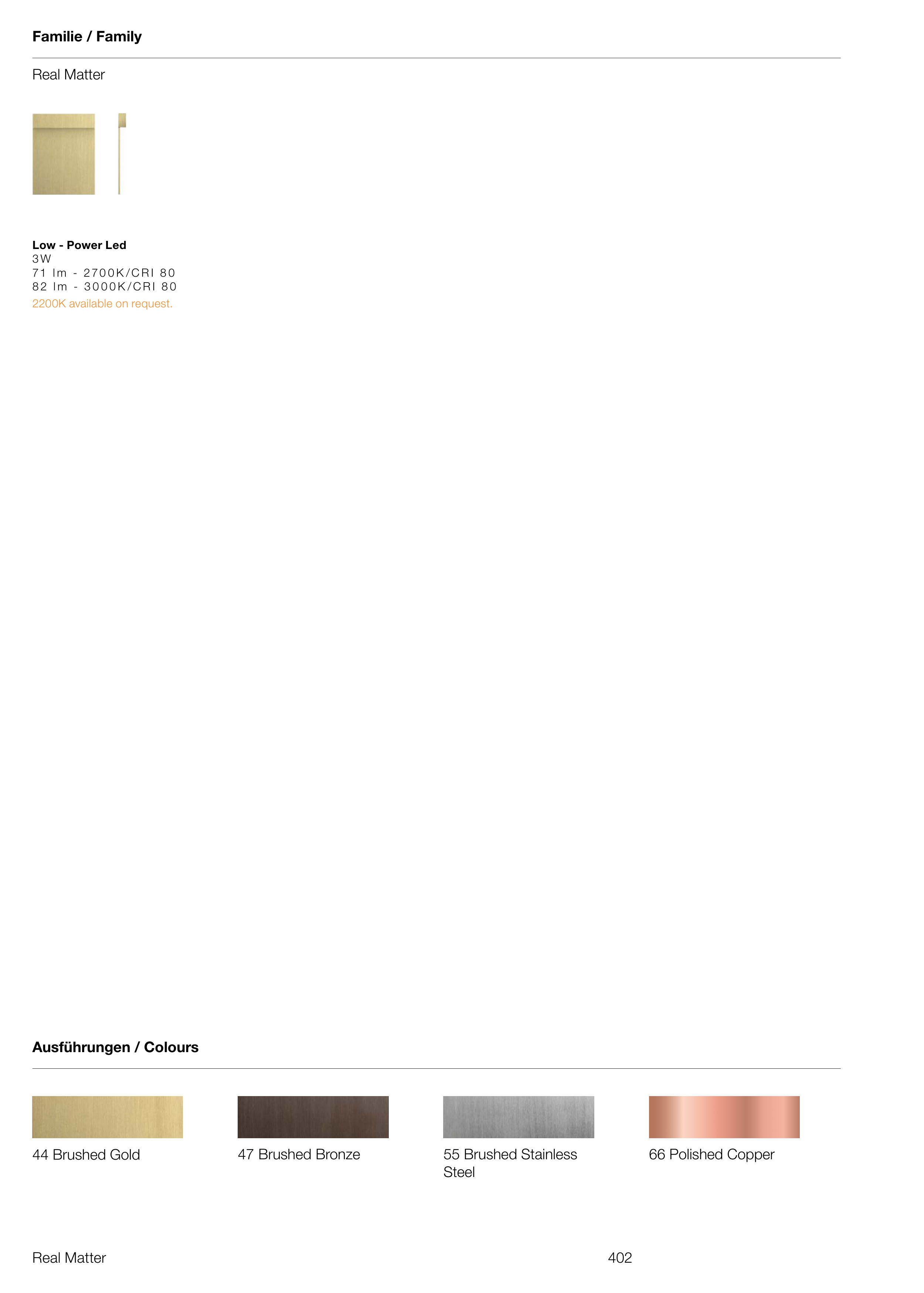 402 Real Matter Real Matter Low - Power Led 3 W 71 l m - 270 0 K /C R I 8 0 8 2 l m - 3 0 0 0 K /C R I 8 0 44 Brushed Gold 66 Polished Copper 47 Brushed Bronze 55 Brushed Stainless Steel 2200K available on request. Ausführungen / Colours Familie / Family