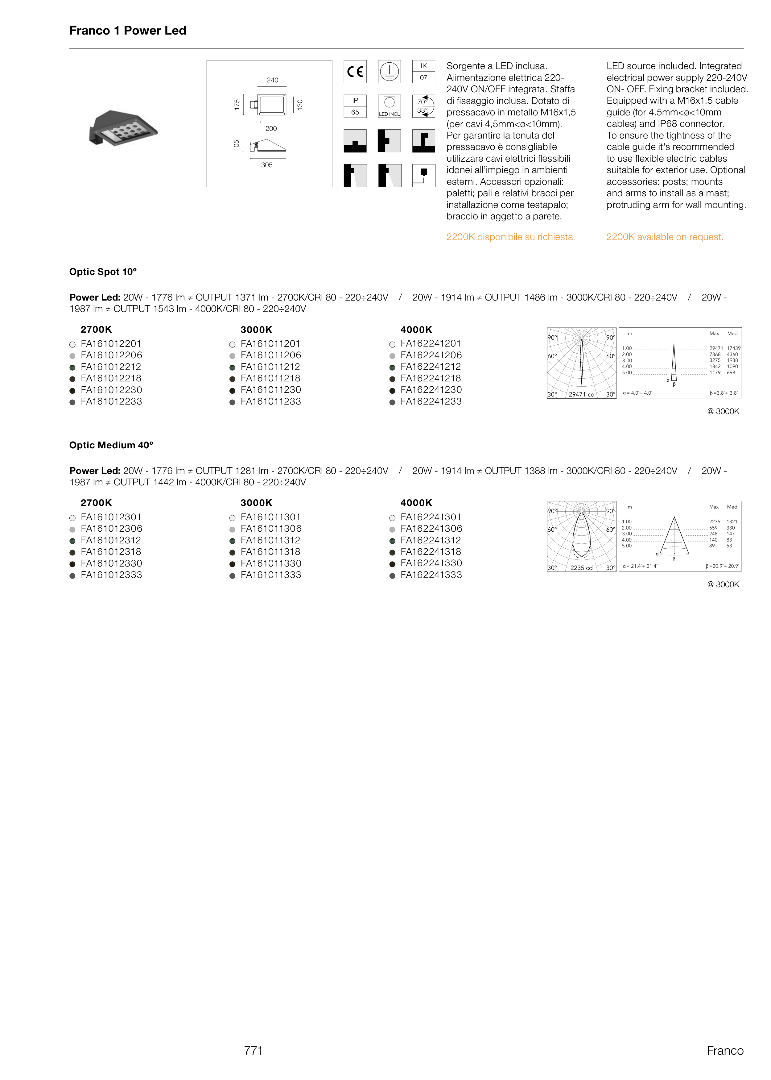 Power Led: 20W - 1776 lm ≠ OUTPUT 1371 lm - 2700K/CRI 80 - 220÷240V / 20W - 1914 lm ≠ OUTPUT 1486 lm - 3000K/CRI 80 - 220÷240V / 20W -