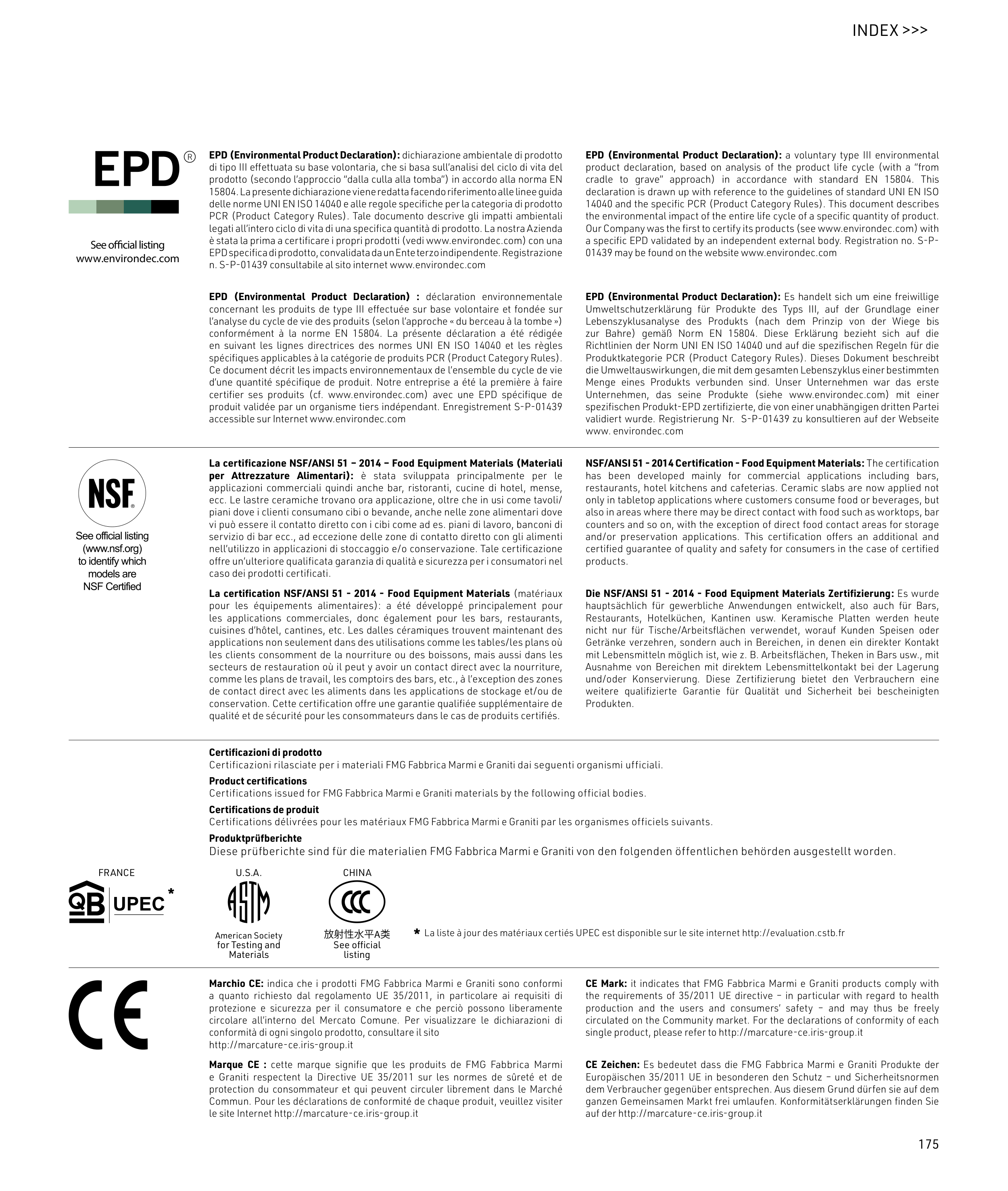 Certifications issued for FMG Fabbrica Marmi e Graniti materials by the following official bodies.