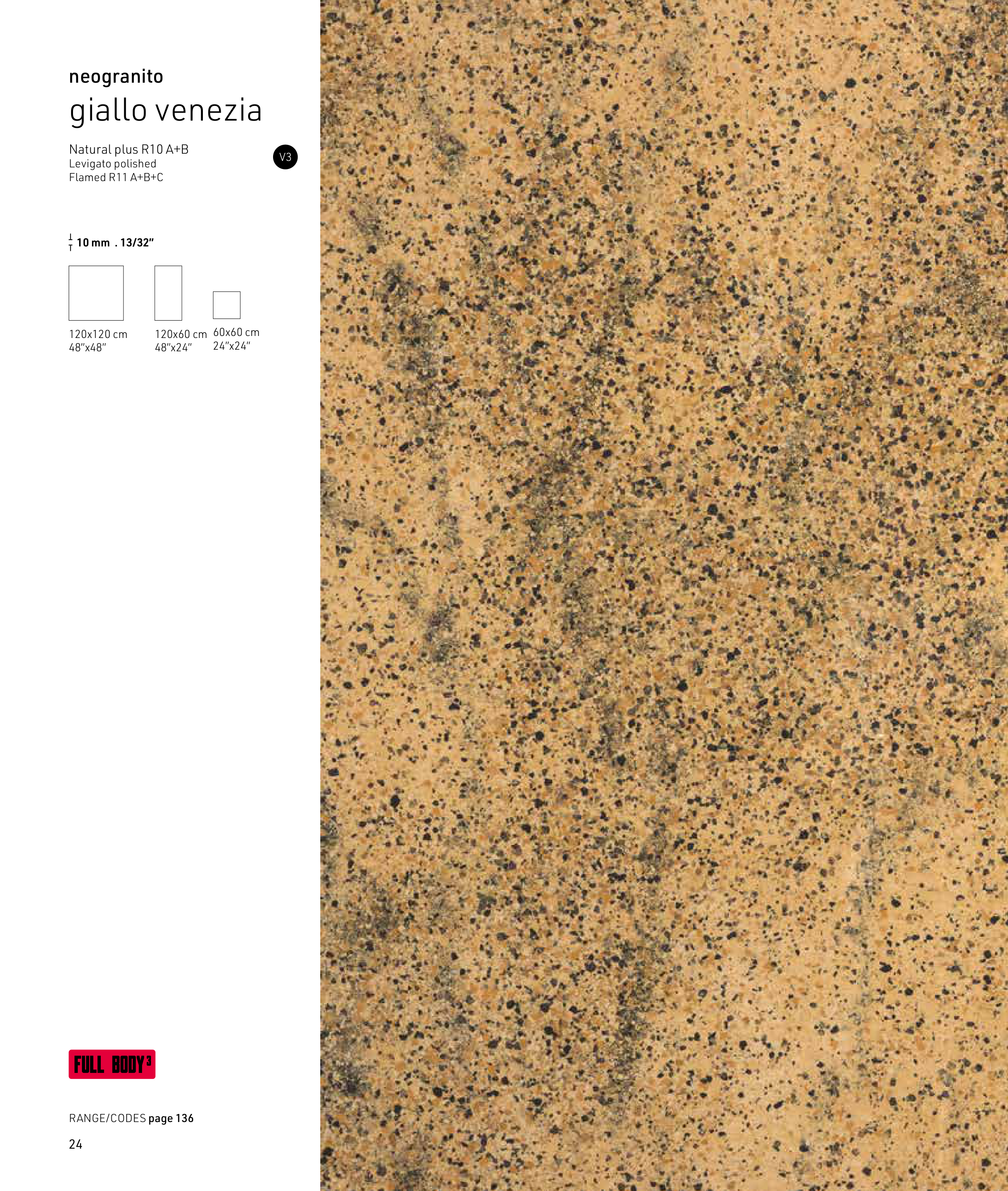 10 mm . 13/32” giallo venezia Natural plus R10 A+B Levigato polished Flamed R11 A+B+C neogranito V3 120x60 cm 48”x24” 60x60 cm 24”x24” 120x120 cm 48”x48” RANGE/CODES page 136 24