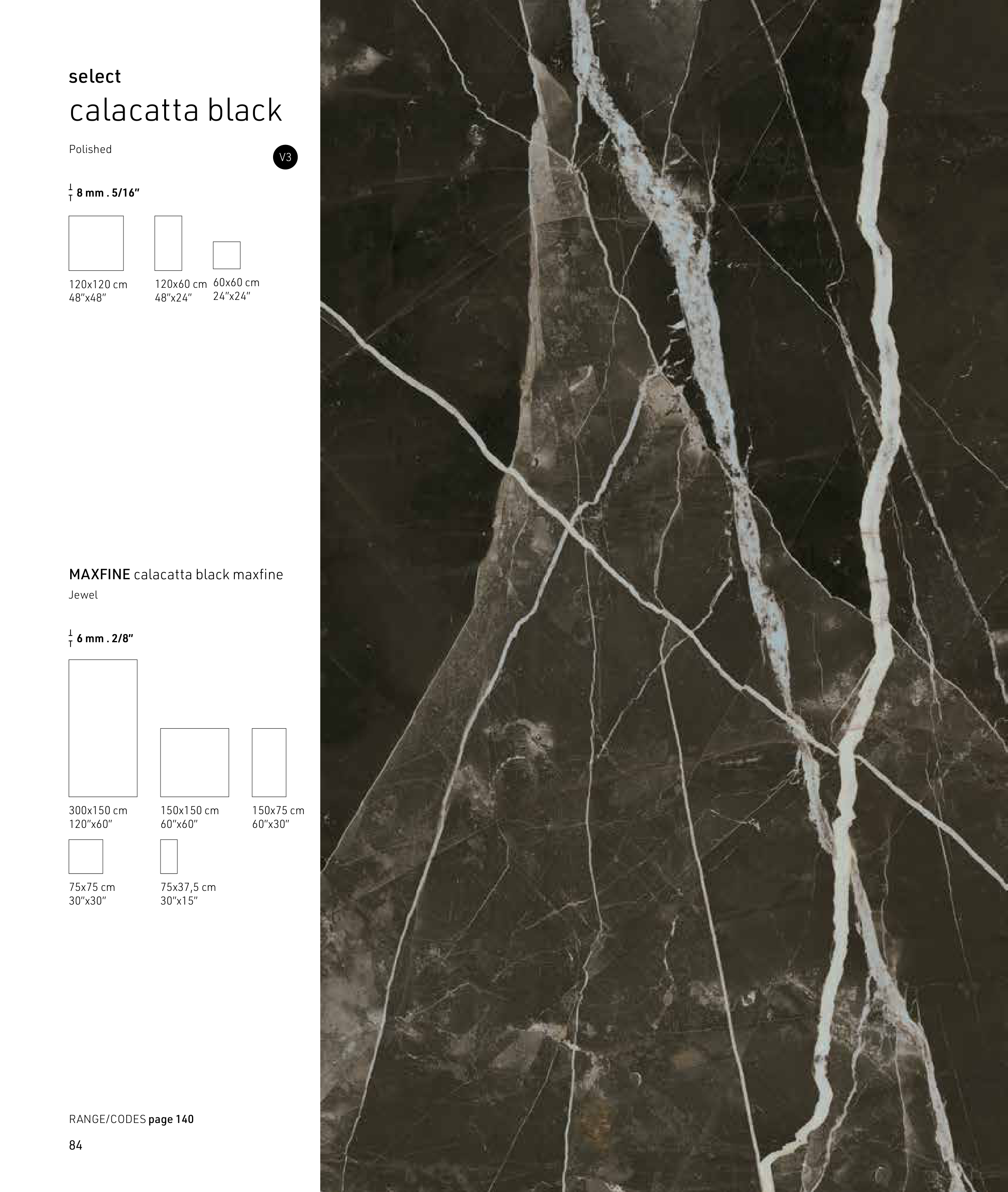 150x75 cm 60”x30” 150x150 cm 60”x60” 300x150 cm 120”x60” 75x75 cm 30”x30” 75x37,5 cm 30”x15” calacatta black select V3 MAXFINE calacatta black maxfine 6 mm . 2/8” Jewel 8 mm . 5/16” 120x60 cm 48”x24” 60x60 cm 24”x24” 120x120 cm 48”x48” Polished RANGE/CODES page 140 84