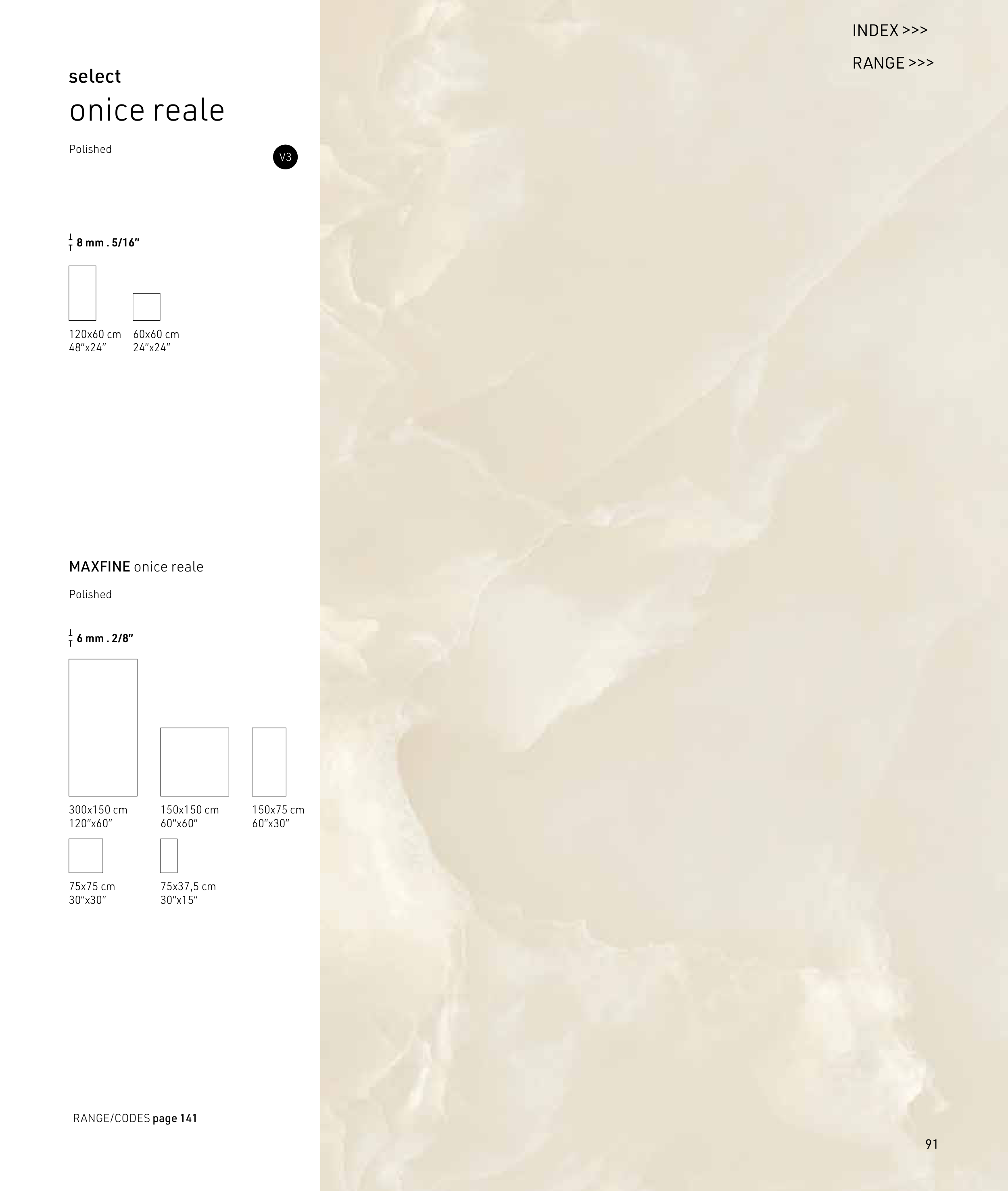 Polished select 8 mm . 5/16” MAXFINE onice reale 6 mm . 2/8” Polished V3 onice reale 150x75 cm 60”x30” 150x150 cm 60”x60” 300x150 cm 120”x60” 75x75 cm 30”x30” 75x37,5 cm 30”x15” 120x60 cm 48”x24” 60x60 cm 24”x24” RANGE/CODES page 141 91 INDEX >>> RANGE >>>