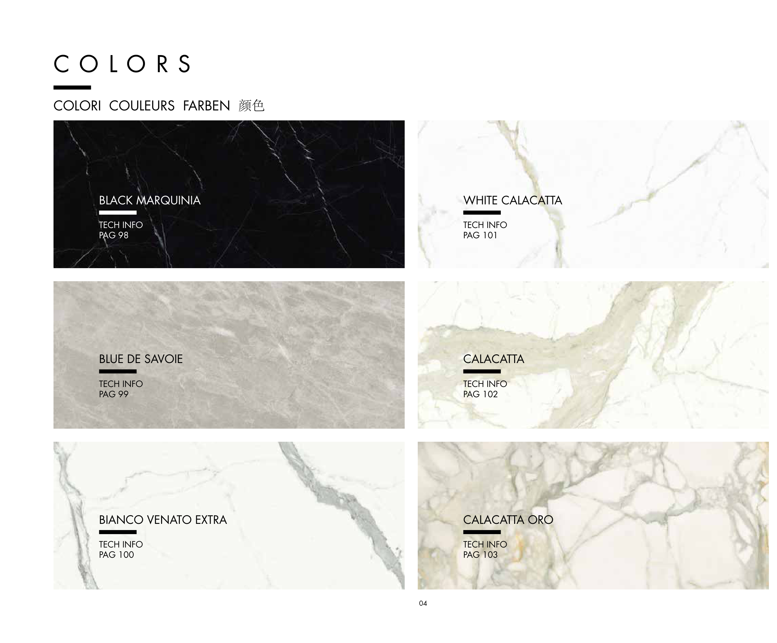 WHITE CALACATTA TECH INFO PAG 101 BLACK MARQUINIA TECH INFO PAG 98 C O L O R S COLORI COULEURS FARBEN 颜色 CALACATTA TECH INFO PAG 102 CALACATTA ORO TECH INFO PAG 103 BLUE DE SAVOIE TECH INFO PAG 99 BIANCO VENATO EXTRA TECH INFO PAG 100 04