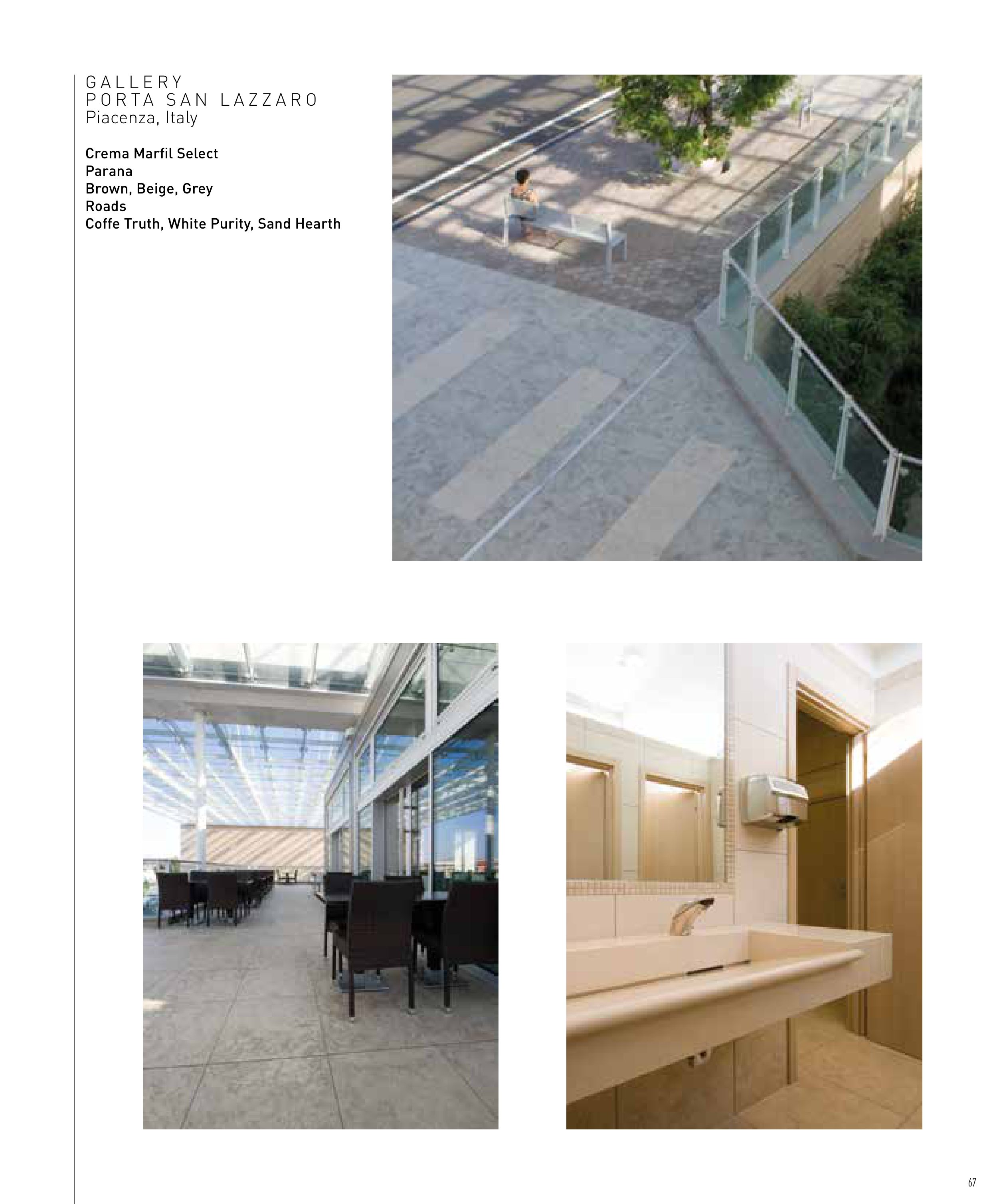 G A L L E R Y P O R T A S A N L A Z Z A R O Piacenza, Italy Crema Marfil Select Parana Brown, Beige, Grey Roads Coffe Truth, White Purity, Sand Hearth 67