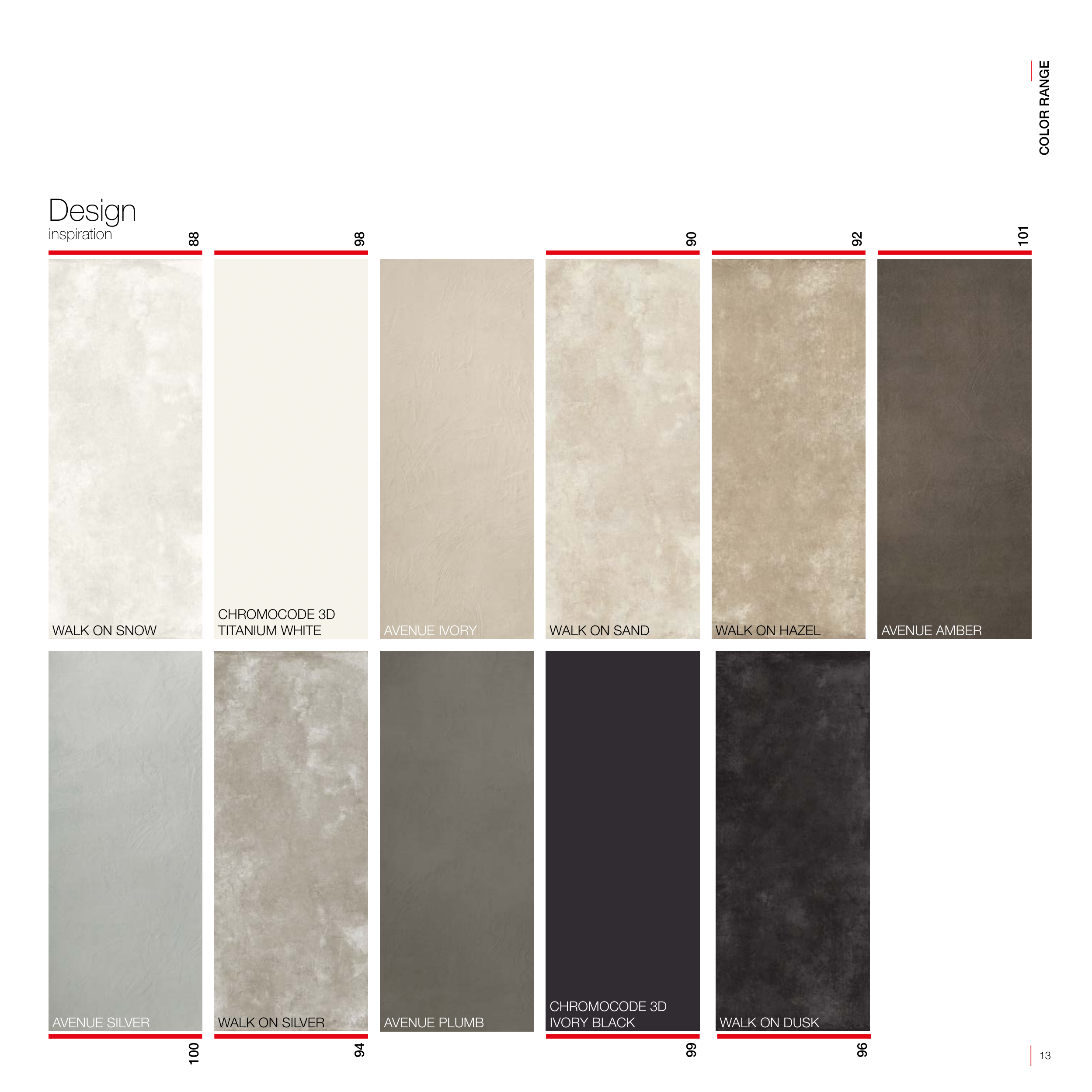 AVENUE PLUMB Design inspiration CHROMOCODE 3D IVORY BLACK WALK ON DUSK WALK ON SILVER CHROMOCODE 3D TITANIUM WHITE WALK ON SNOW WALK ON SAND WALK ON HAZEL AVENUE IVORY AVENUE AMBER AVENUE SILVER COLOR RANGE 88 98 90 92 101 100 94 99 96 13