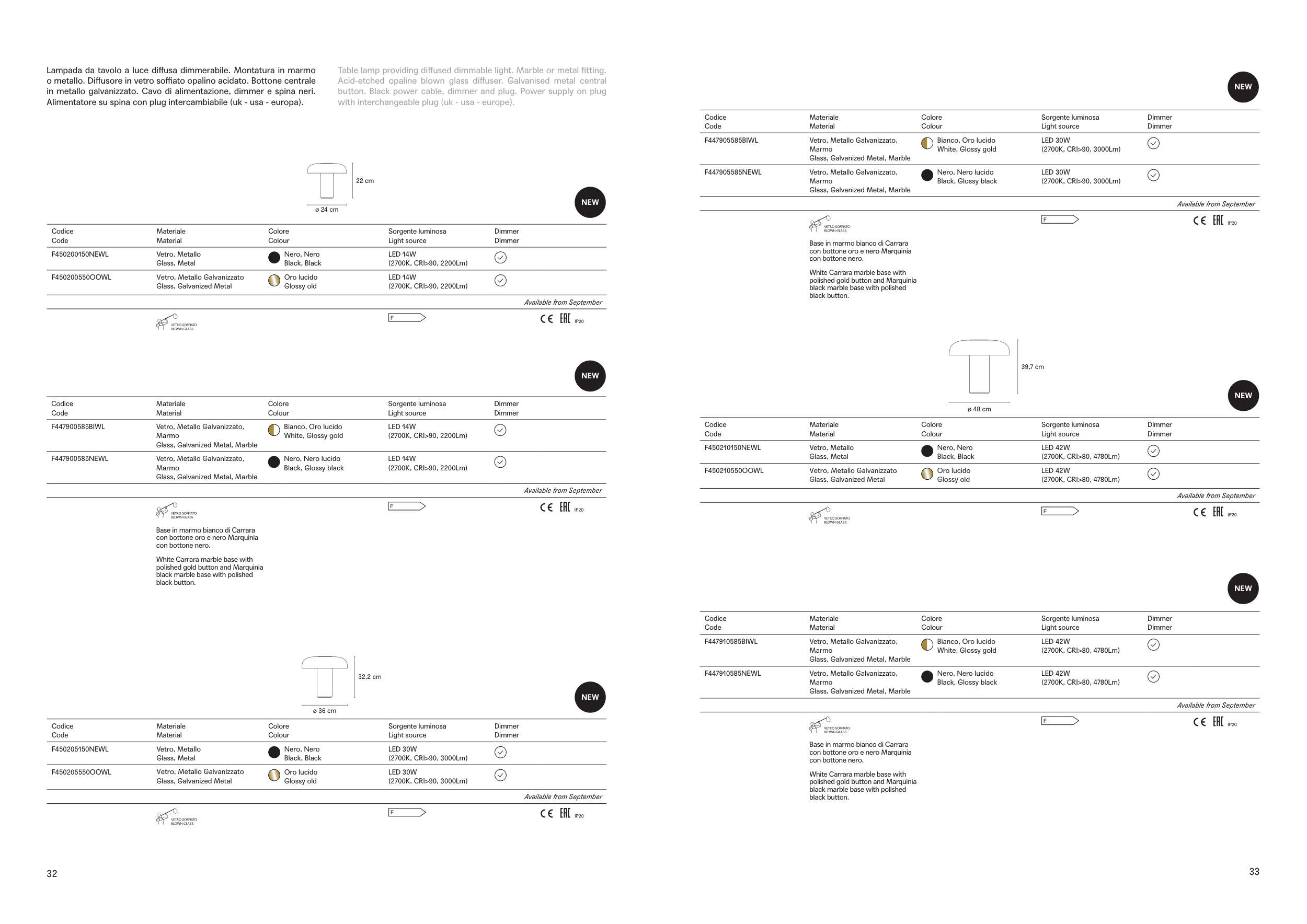 Table lamp providing diffused dimmable light. Marble or metal fitting.
