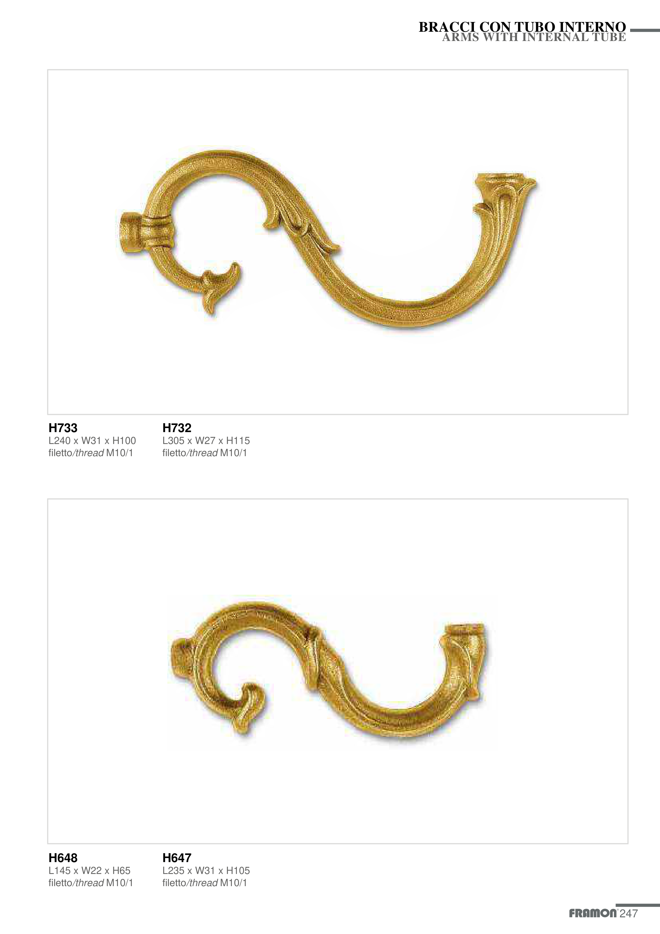 247 BRACCI CON TUBO INTERNO ARMS WITH INTERNAL TUBE H648 L145 x W22 x H65 filetto/thread M10/1 H647 L235 x W31 x H105 filetto/thread M10/1 H733 L240 x W31 x H100 filetto/thread M10/1 H732 L305 x W27 x H115 filetto/thread M10/1