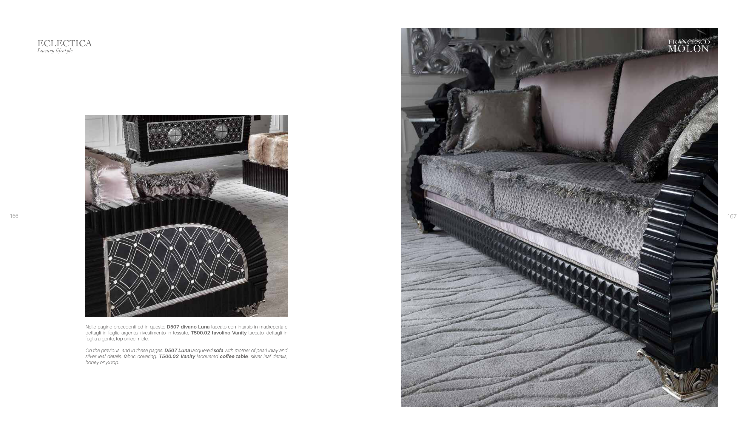 On the previous and in these pages: D507 Luna lacquered sofa with mother of pearl inlay and