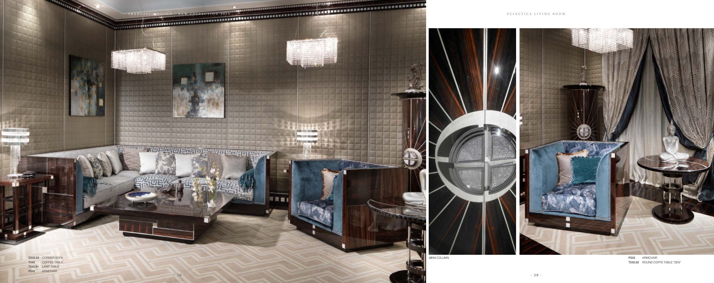 D542.02 CORNER SOFA T542 COFFEE TABLE T542.01 LAMP TABLE P542 ARMCHAIR P542 ARMCHAIR T542.02 ROUND COFFE TABLE “ZEN” U514 COLUMN - 38 - - 39 - F R A N C E S C O M O L O N - N E W C O L L E C T I O N 2 0 1 5 E C L E C T I C A L I V I N G R O O M