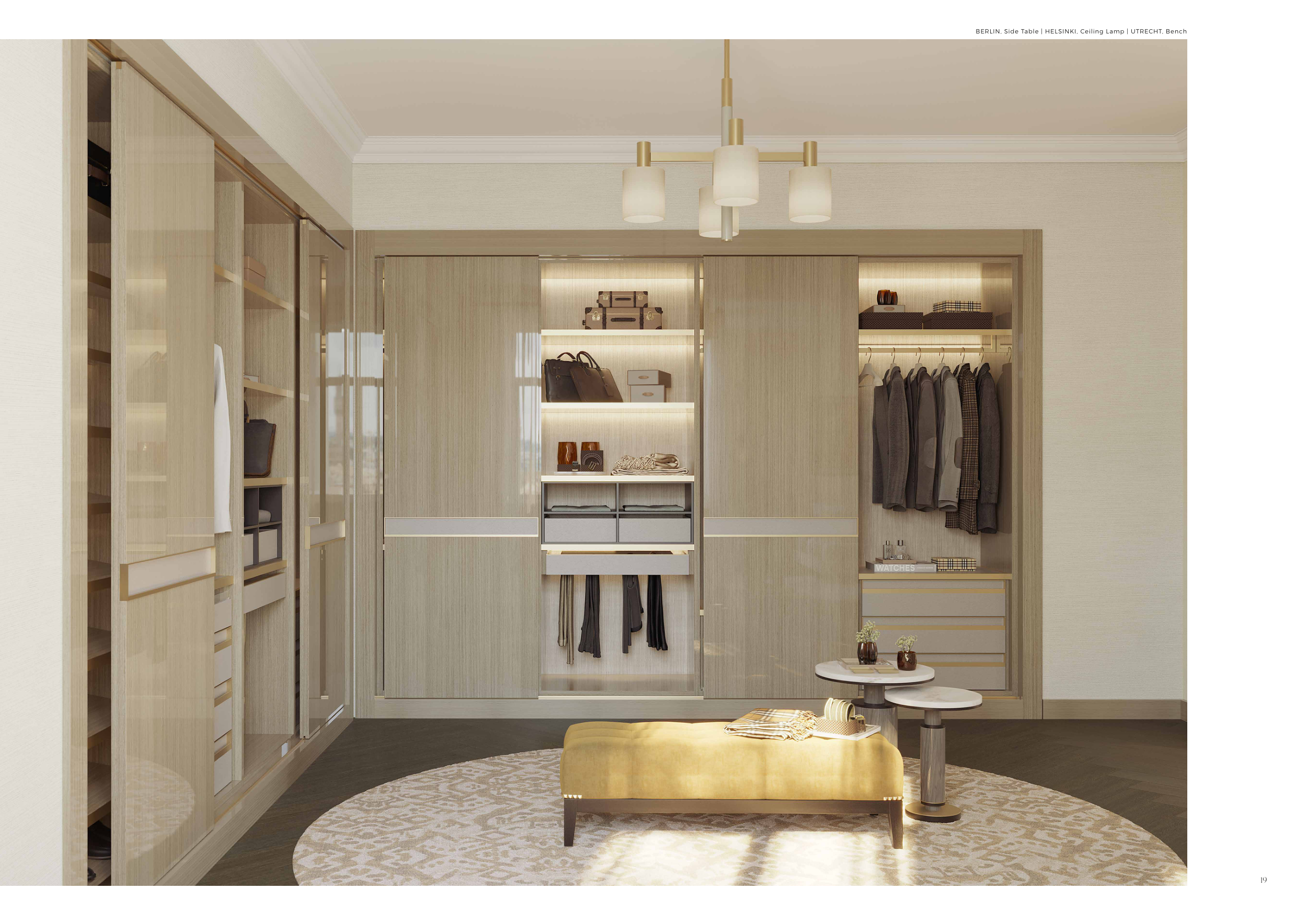 BERLIN, Side Table | HELSINKI, Ceiling Lamp | UTRECHT, Bench