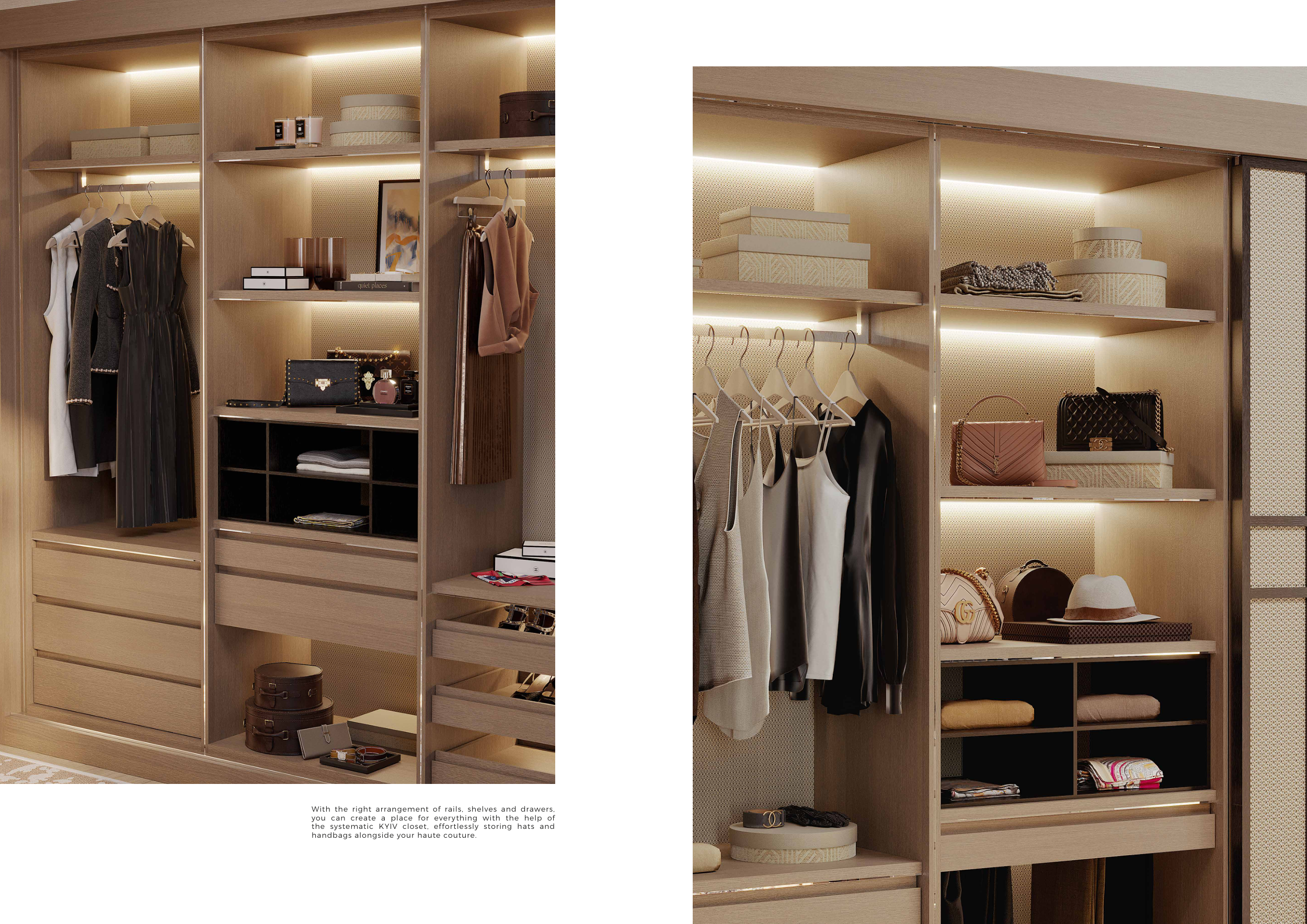 31 With the right arrangement of rails, shelves and drawers, you can create a place for everything with the help of the systematic KYIV closet, effortlessly storing hats and handbags alongside your haute couture.