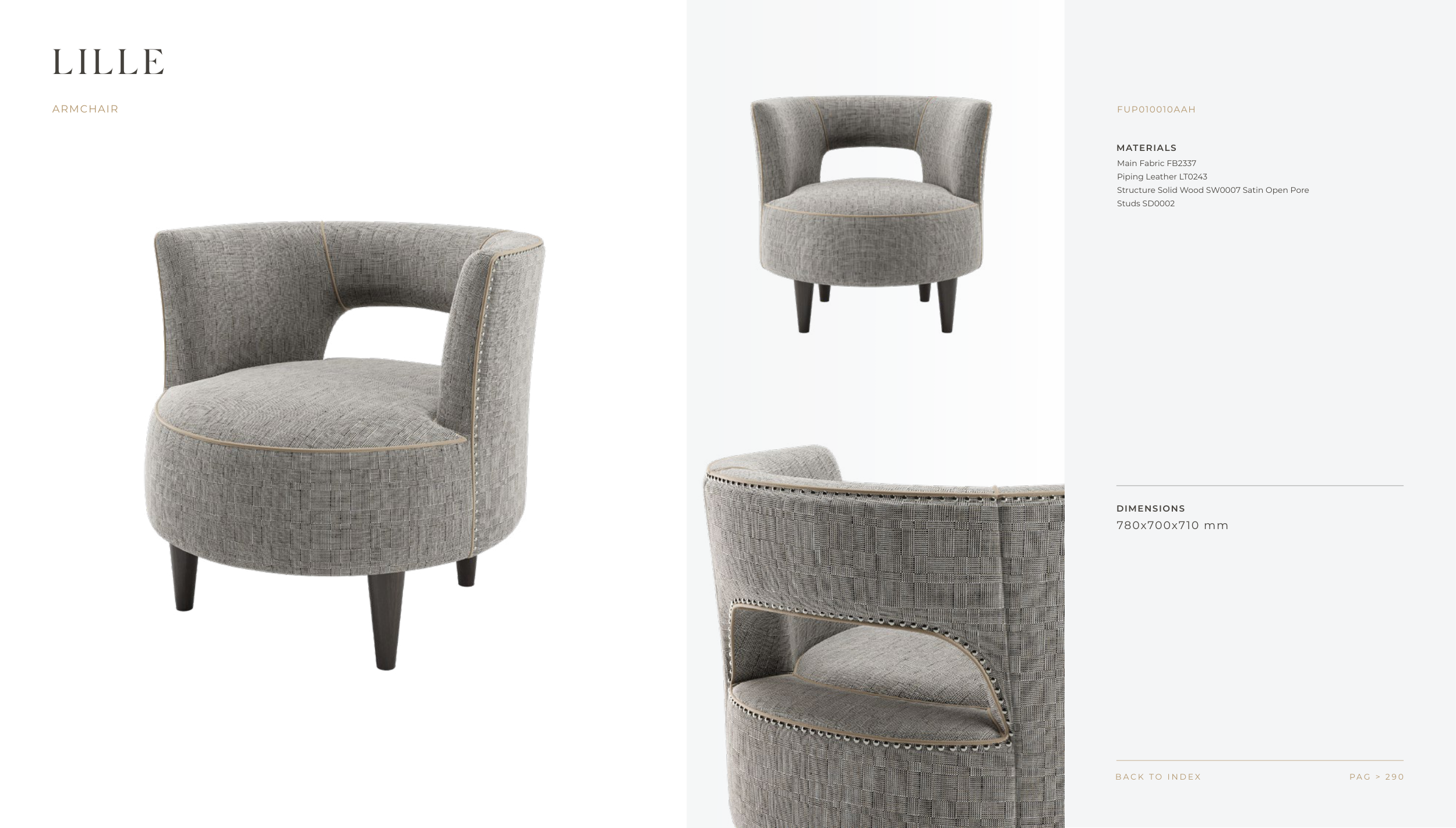 MATERIALS DIMENSIONS P A G > 2 9 0 B A C K T O I N D E X LILLE ARMCHAIR FUP010010AAH Main Fabric FB2337 Piping Leather LT0243 Structure Solid Wood SW0007 Satin Open Pore Studs SD0002 780x700x710 mm F R A T O . C O M