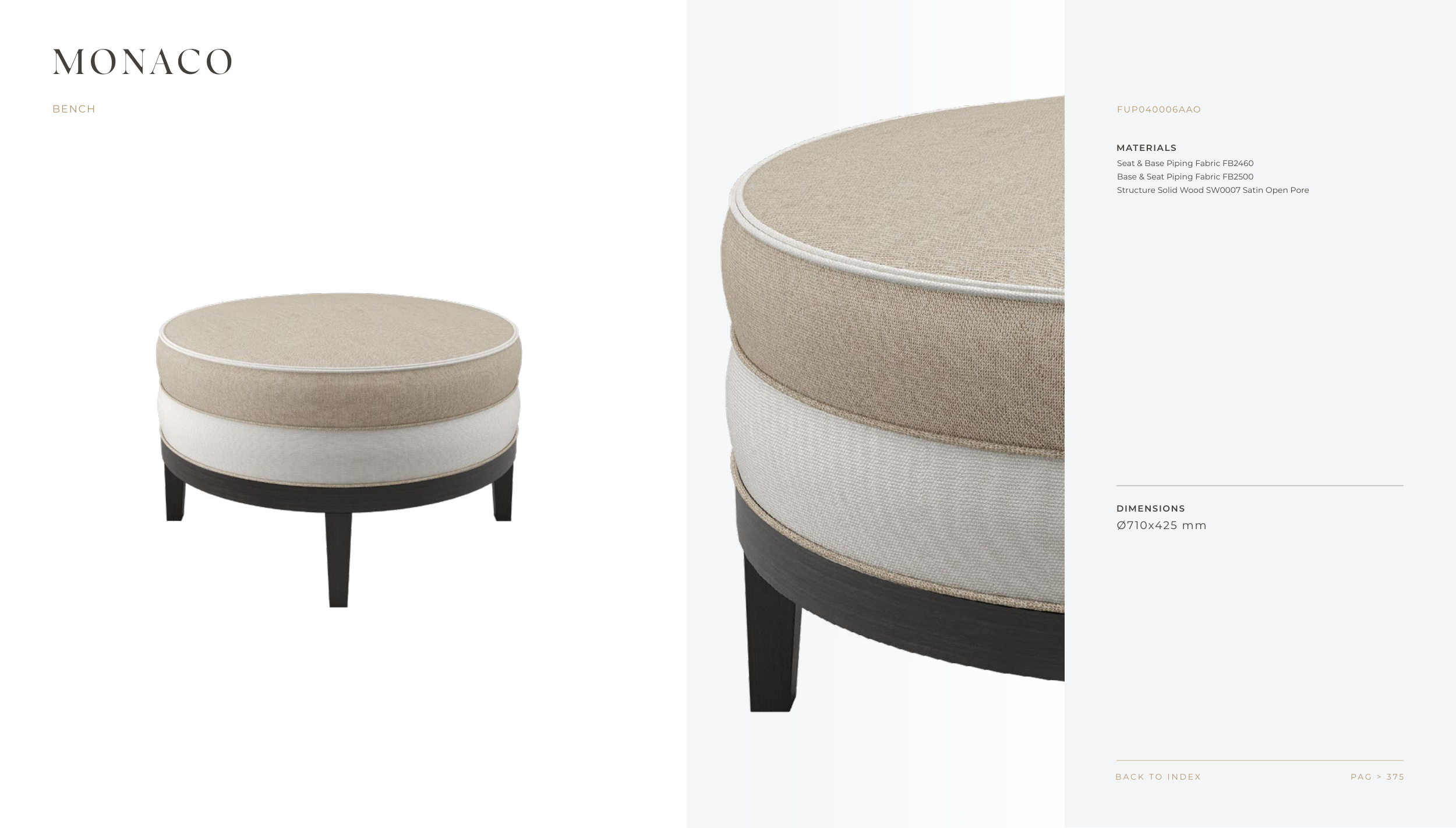 MATERIALS DIMENSIONS P A G > 3 7 5 B A C K T O I N D E X MONACO BENCH Seat & Base Piping Fabric FB2460 Base & Seat Piping Fabric FB2500 Structure Solid Wood SW0007 Satin Open Pore Ø710x425 mm FUP040006AAO F R A T O . C O M