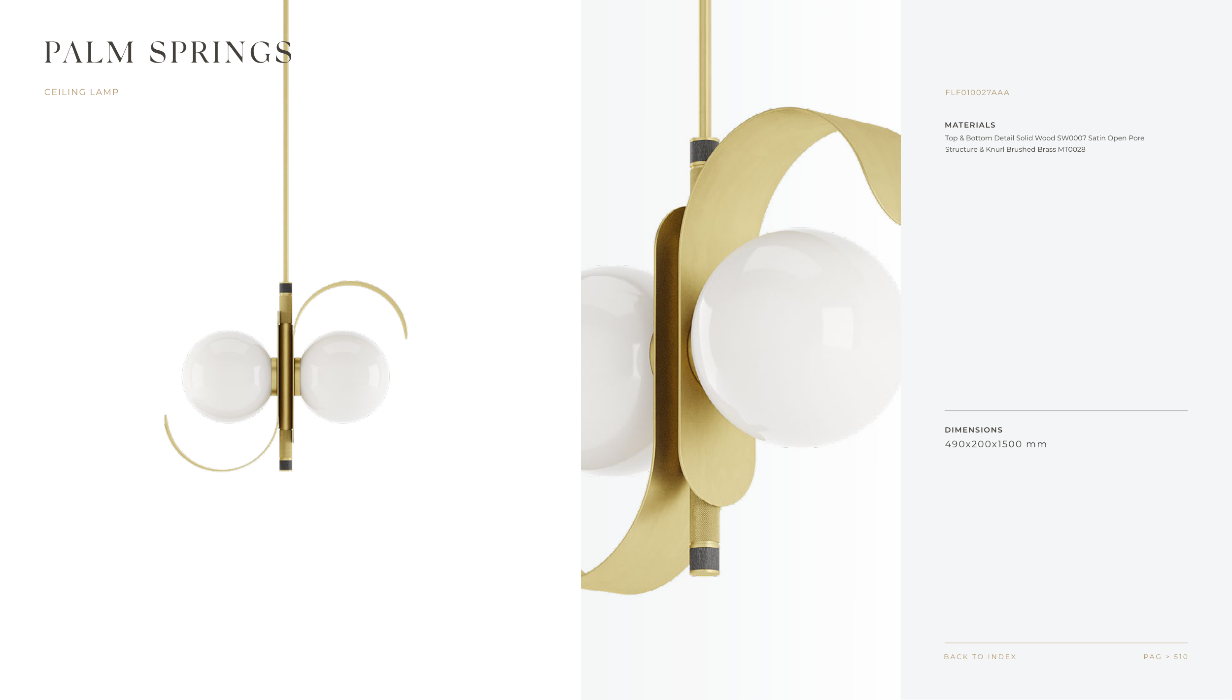 MATERIALS DIMENSIONS P A G > 5 1 0 B A C K T O I N D E X PALM SPRINGS CEILING LAMP FLF010027AAA Top & Bottom Detail Solid Wood SW0007 Satin Open Pore Structure & Knurl Brushed Brass MT0028 490x200x1500 mm F R A T O . C O M