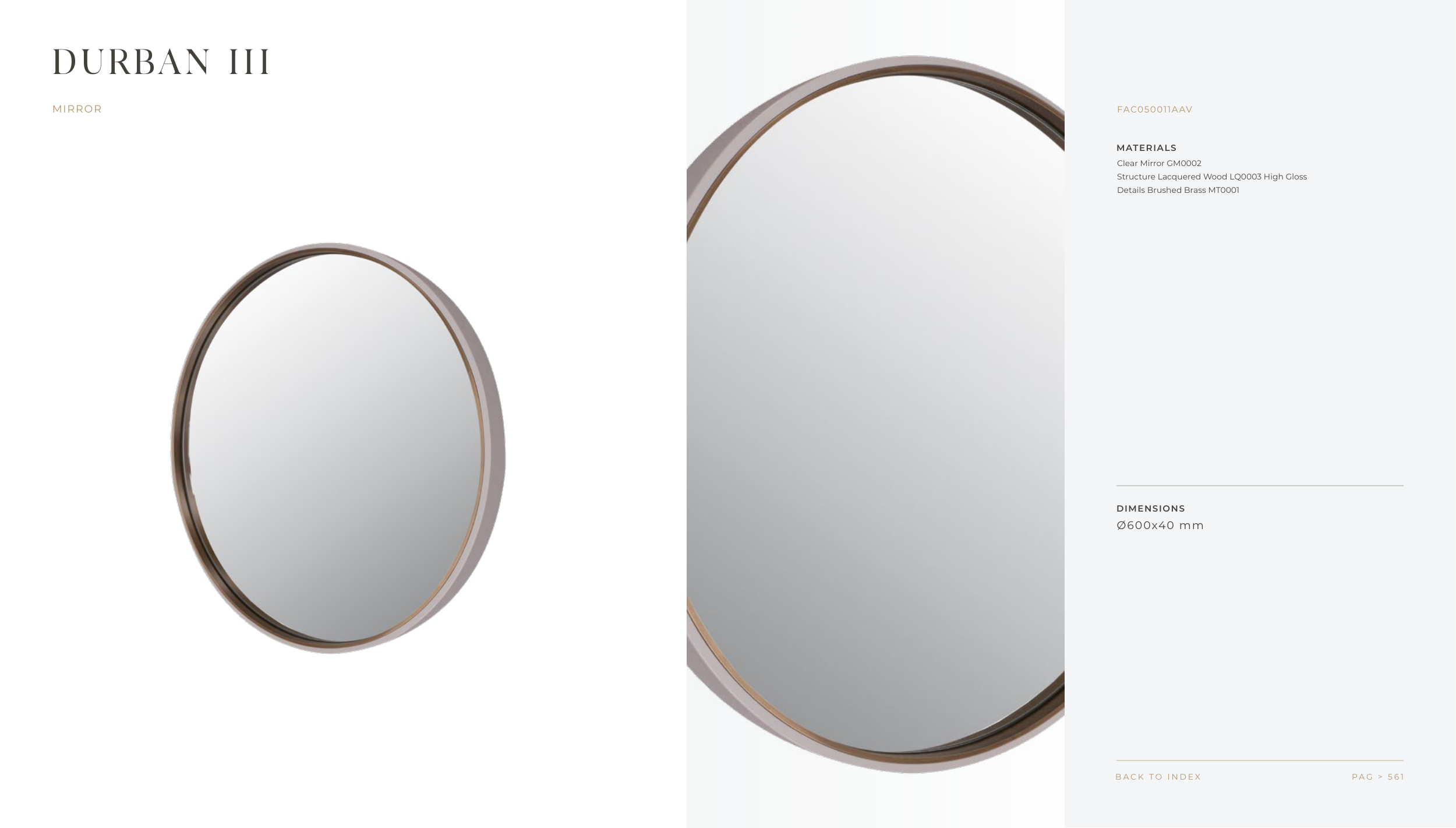 MATERIALS DIMENSIONS P A G > 5 6 1 B A C K T O I N D E X DURBAN III MIRROR FAC050011AAV Clear Mirror GM0002 Structure Lacquered Wood LQ0003 High Gloss Details Brushed Brass MT0001 Ø600x40 mm F R A T O . C O M