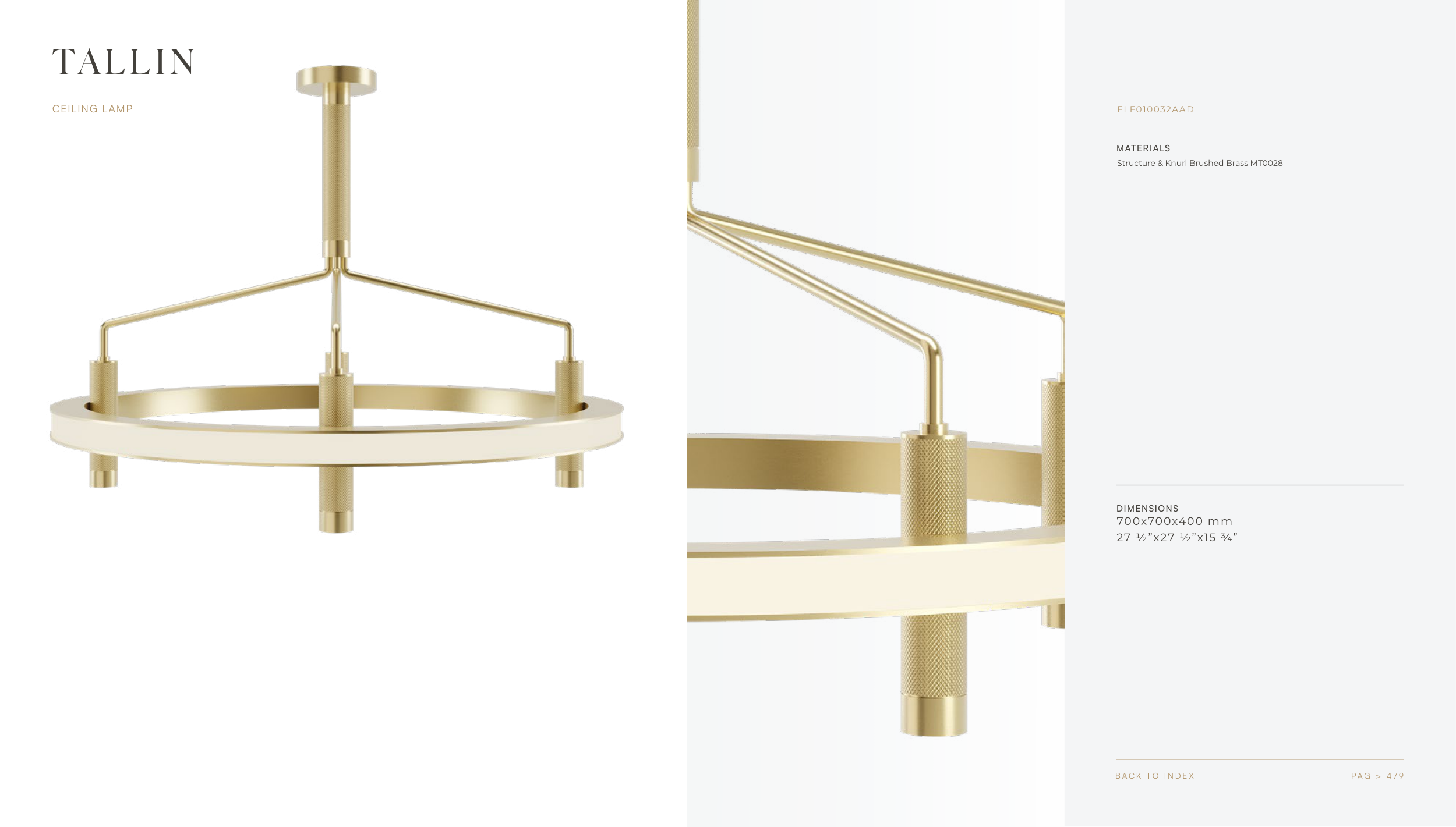 MATERIALS DIMENSIONS P A G > 4 7 9 B A C K T O I N D E X TALLIN CEILING LAMP FLF010032AAD Structure & Knurl Brushed Brass MT0028 700x700x400 mm 27 ½”x27 ½”x15 ¾” F R AT O . C O M