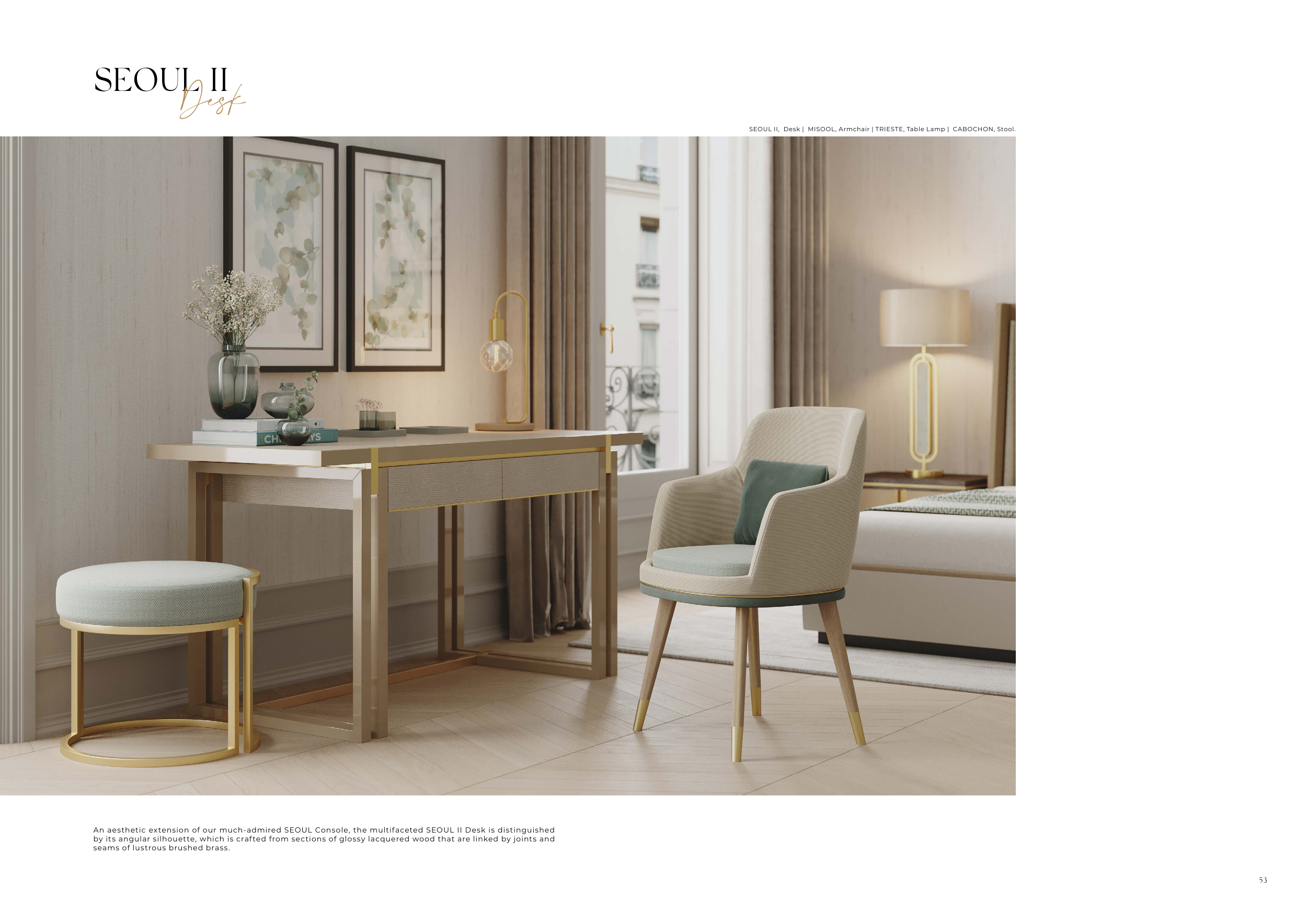 SEOUL II, Desk | MISOOL, Armchair | TRIESTE, Table Lamp | CABOCHON, Stool.