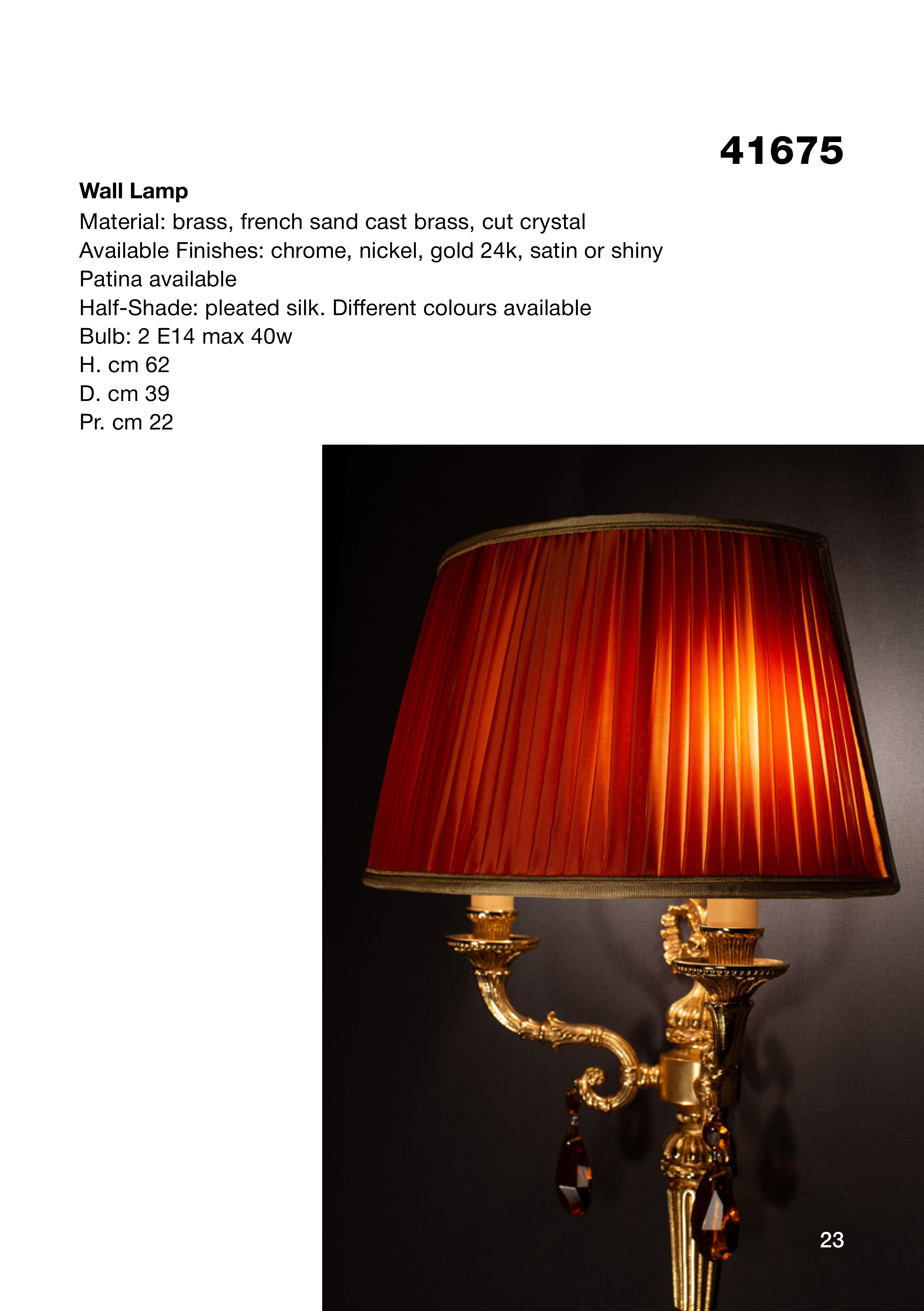 41675 Wall Lamp Material: brass, french sand cast brass, cut crystal Available Finishes: chrome, nickel, gold 24k, satin or shiny Patina available Half-Shade: pleated silk. Different colours available Bulb: 2 E14 max 40w H. cm 62 D. cm 39 Pr. cm 22 23