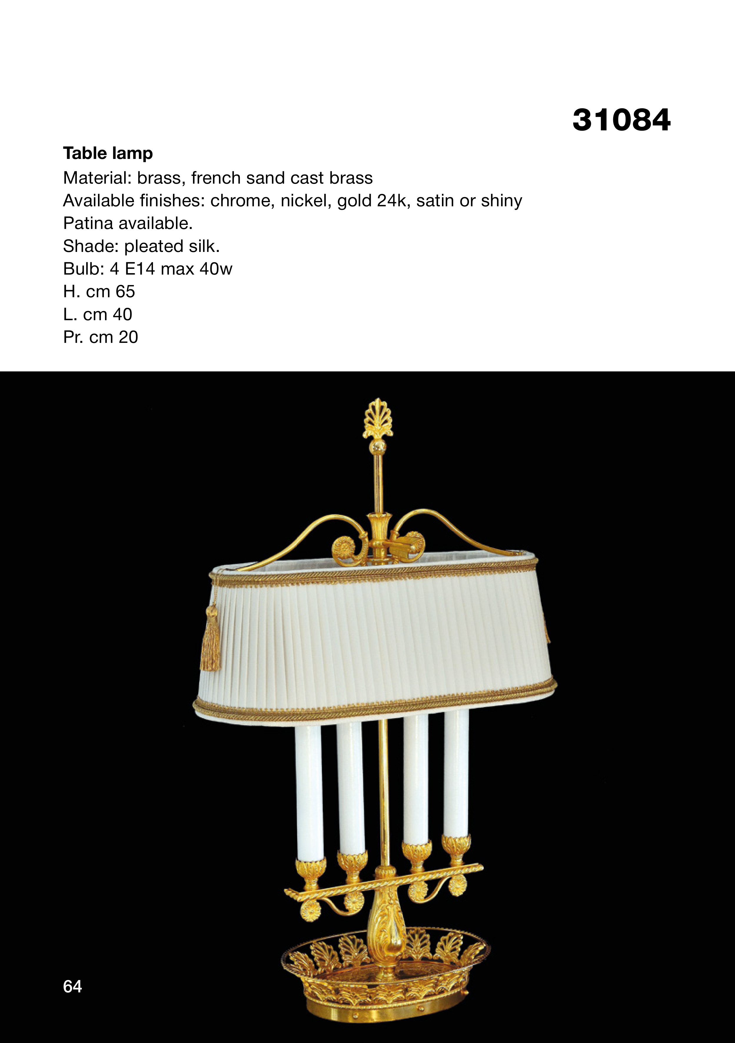 31084 Table lamp Material: brass, french sand cast brass Available finishes: chrome, nickel, gold 24k, satin or shiny Patina available. Shade: pleated silk. Bulb: 4 E14 max 40w H. cm 65 L. cm 40 Pr. cm 20 64