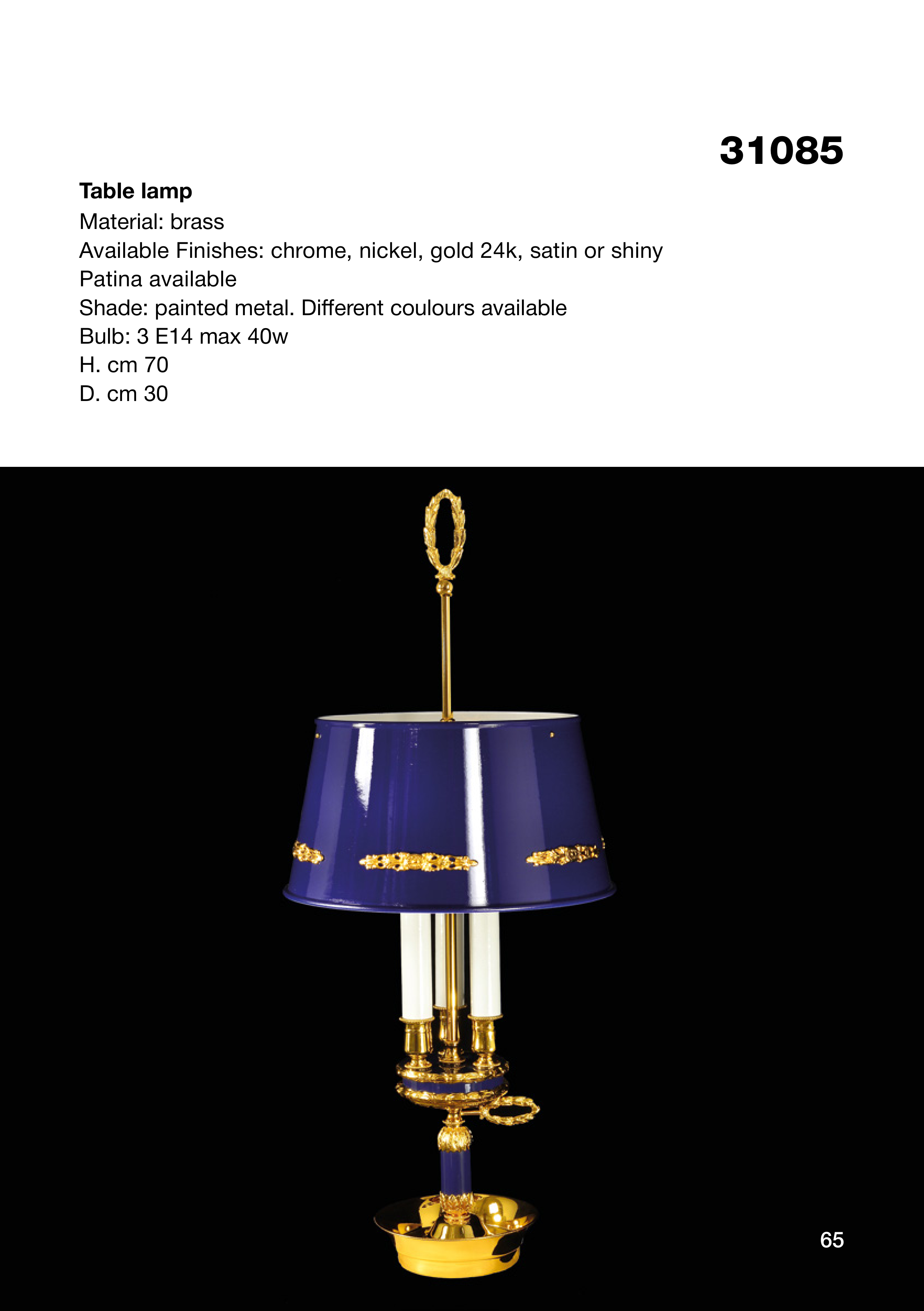 31085 Table lamp Material: brass Available Finishes: chrome, nickel, gold 24k, satin or shiny Patina available Shade: painted metal. Different coulours available Bulb: 3 E14 max 40w H. cm 70 D. cm 30 65