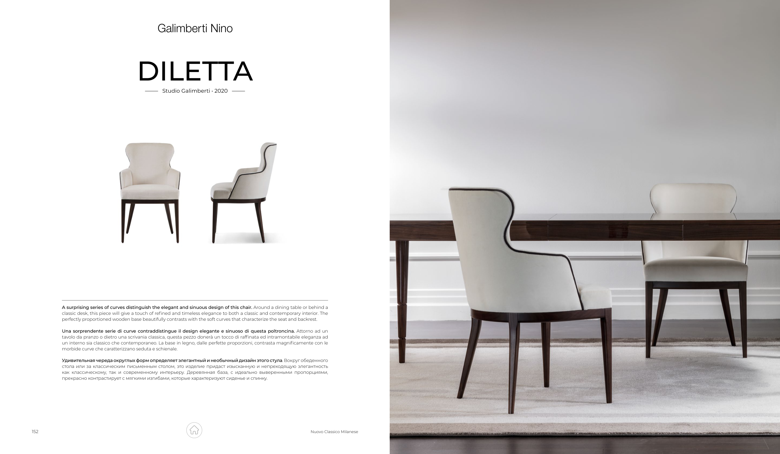 A surprising series of curves distinguish the elegant and sinuous design of this chair. Around a dining table or behind a