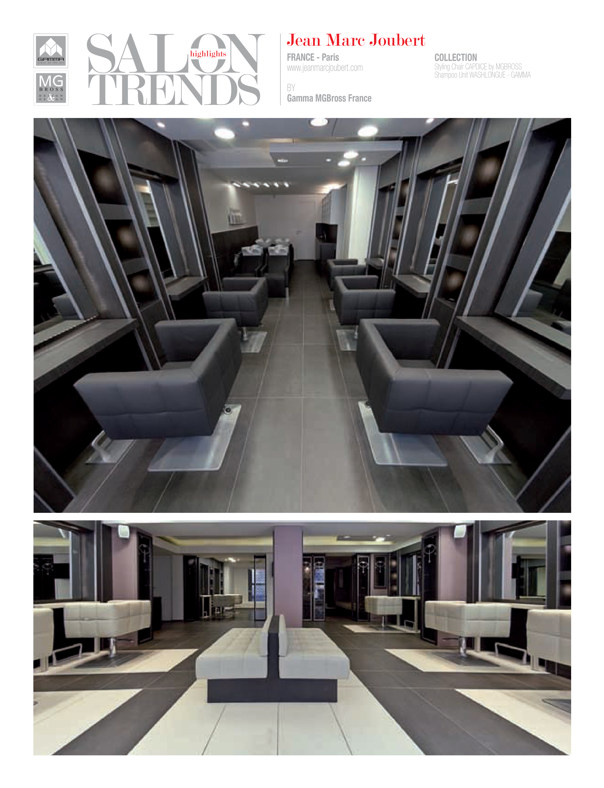 FRANCE - Paris www.jeanmarcjoubert.com BY Gamma MGBross France COLLECTION Styling Chair CAPDICE by MGBROSS Shampoo Unit WASHLONGUE - GAMMA Jean Marc Joubert