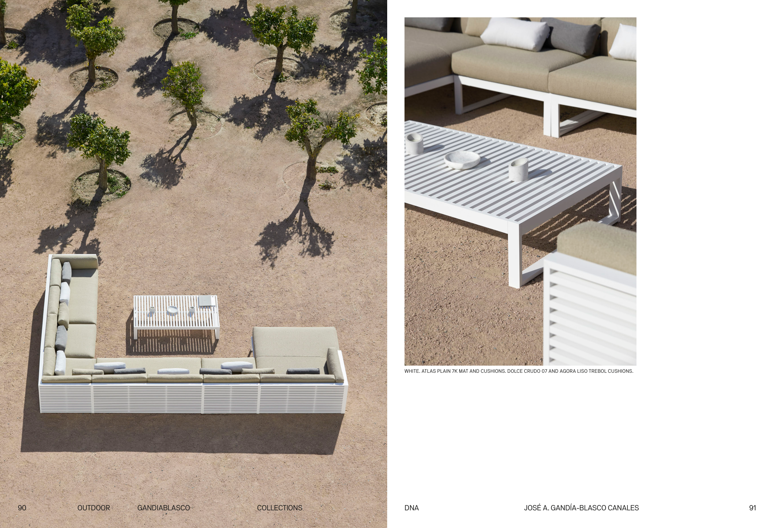 91 OUTDOOR 90 GANDIABLASCO COLLECTIONS DNA JOSÉ A. GANDÍA-BLASCO CANALES WHITE. ATLAS PLAIN 7K MAT AND CUSHIONS. DOLCE CRUDO 07 AND AGORA LISO TREBOL CUSHIONS.