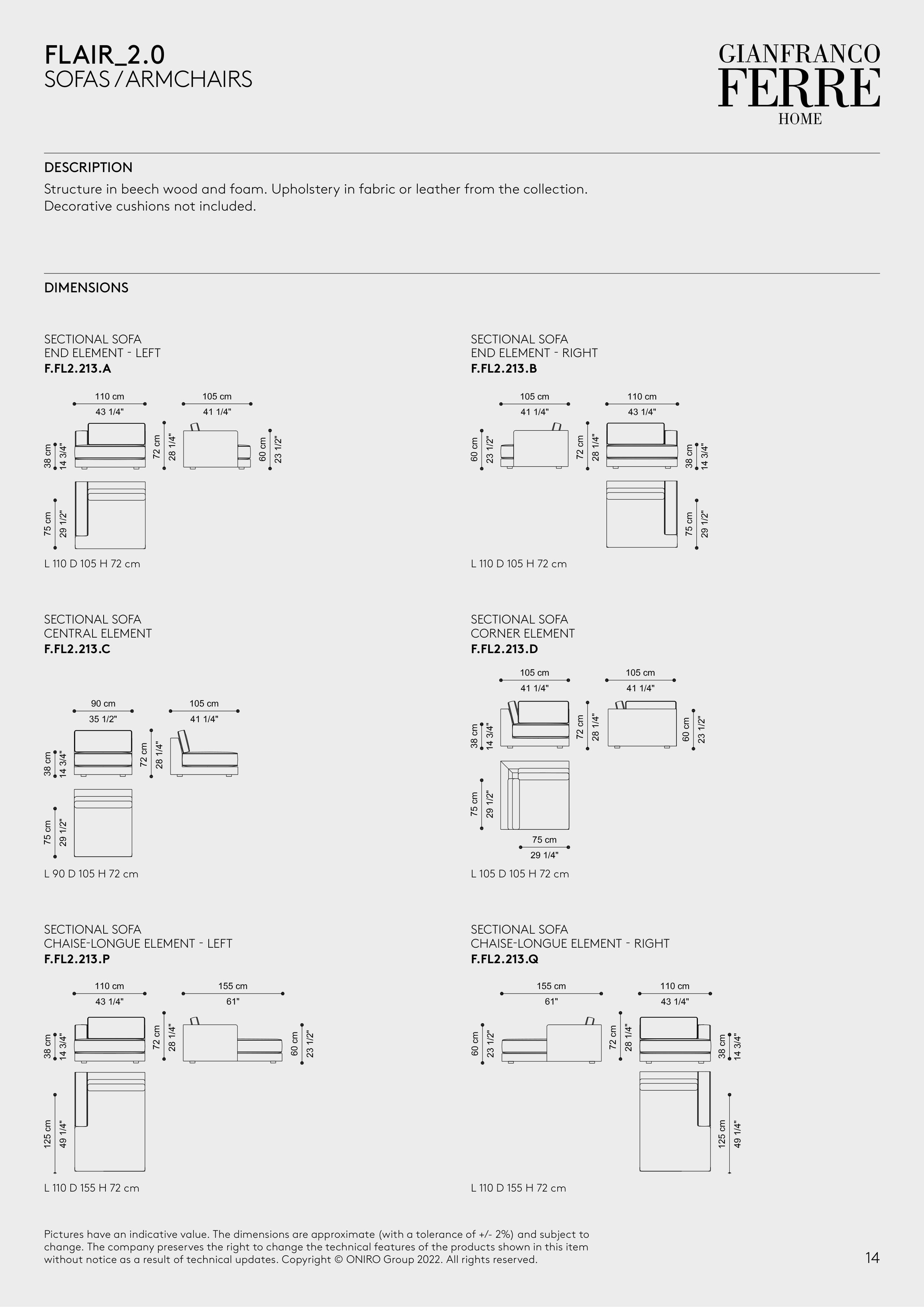 Structure in beech wood and foam. Upholstery in fabric or leather from the collection.