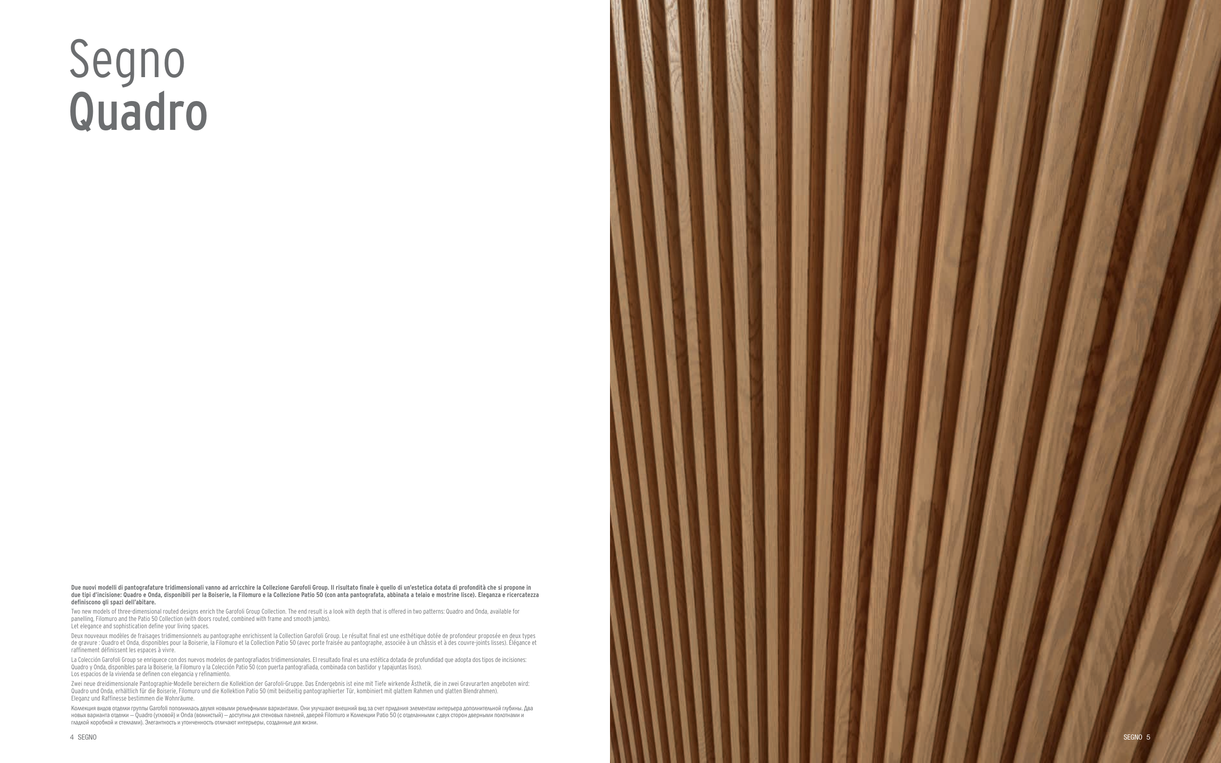 новых варианта отделки — Quadro (угловой) и Onda (волнистый) — доступны для стеновых панелей, дверей Filomuro и Kоллекции Patio 50 (с отделанными с двух сторон дверными полотнами и