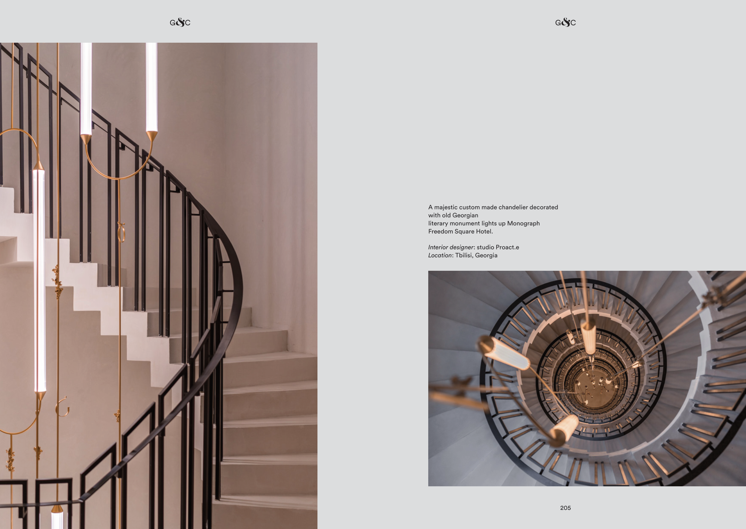 205 204 A majestic custom made chandelier decorated with old Georgian literary monument lights up Monograph Freedom Square Hotel. Interior designer: studio Proact.e Location: Tbilisi, Georgia