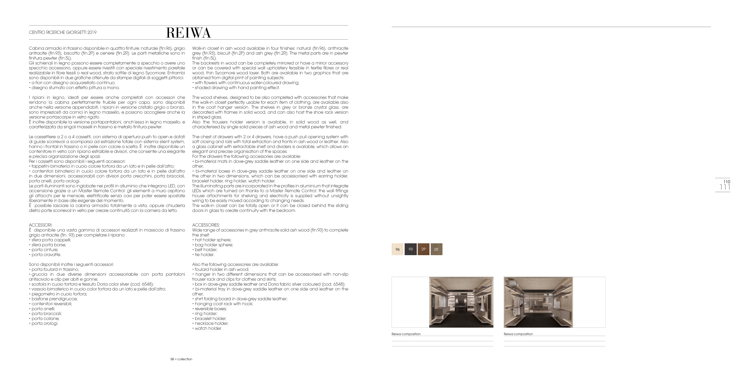 Walk-in closet in ash wood available in four finishes: natural (fin.96), anthracite