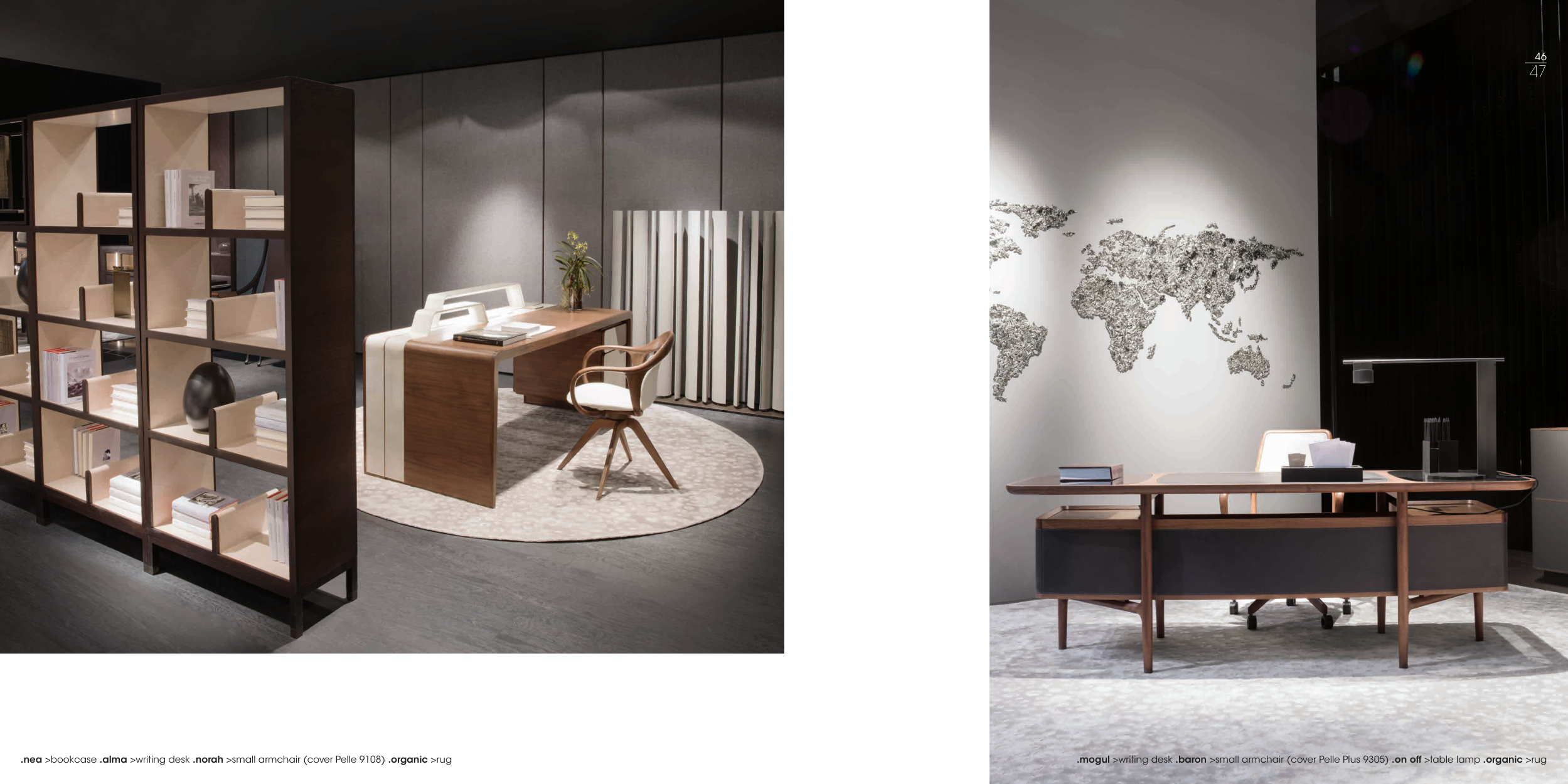 .nea >bookcase .alma >writing desk .norah >small armchair (cover Pelle 9108) .organic >rug