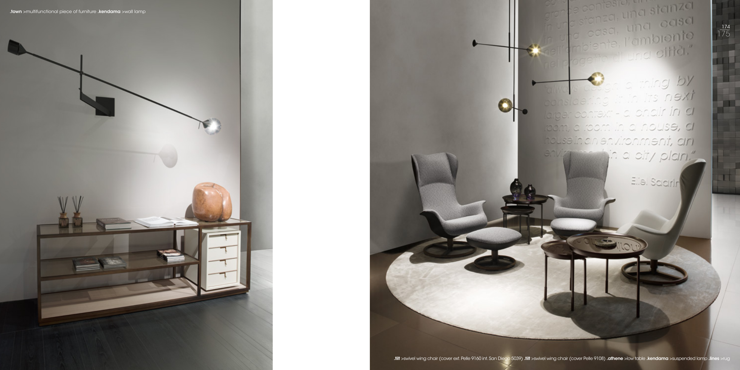 .tilt >swivel wing chair (cover ext. Pelle 9160 int. San Diego 5039) .tilt >swivel wing chair (cover Pelle 9108) .athene >low table .kendama >suspended lamp .lines >rug