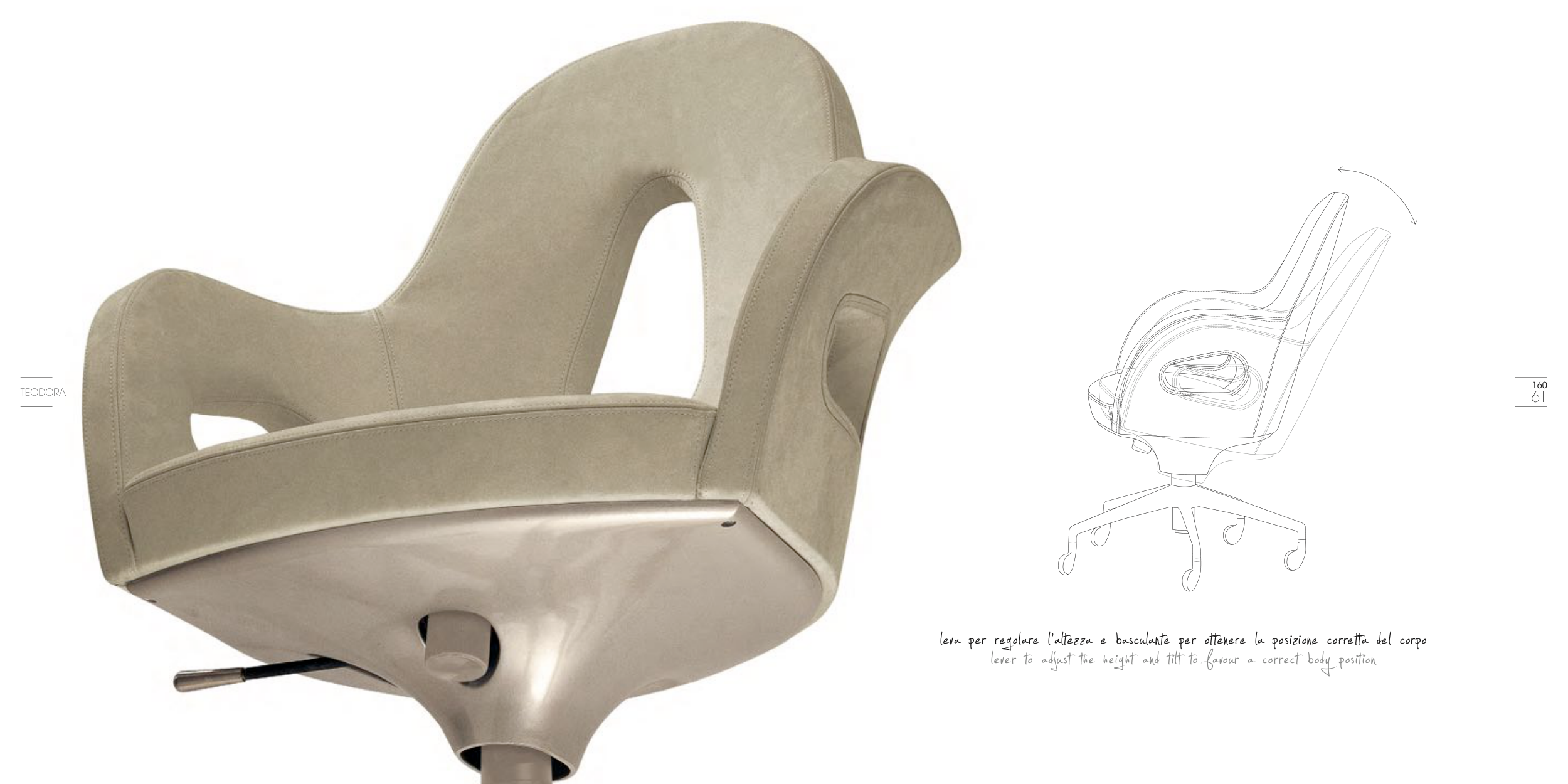 leva per regolare l’altezza e basculante per ottenere la posizione corretta del corpo lever to adjust the height and tilt to favour a correct body position 160 161 TEODORA