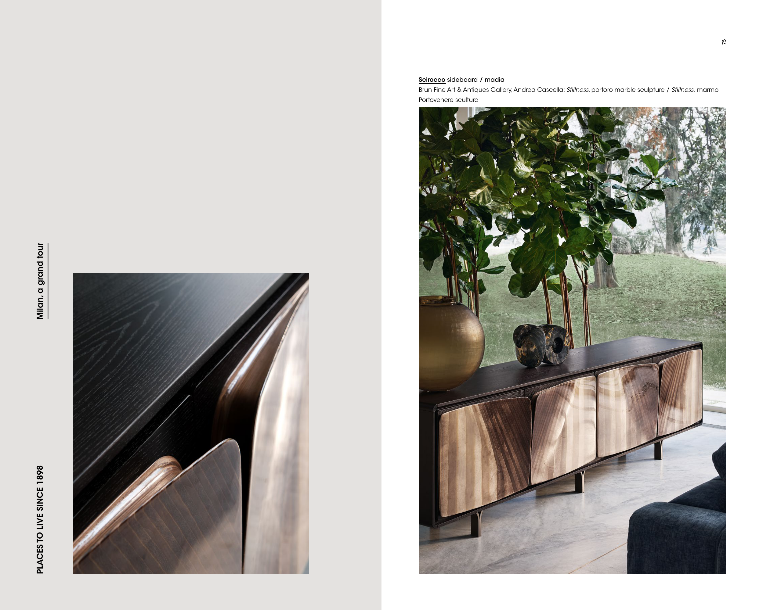 74 75 PLACES TO LIVE SINCE 1898 Milan, a grand tour Scirocco sideboard / madia Brun Fine Art & Antiques Gallery, Andrea Cascella: Stillness, portoro marble sculpture / Stillness, marmo Portovenere scultura