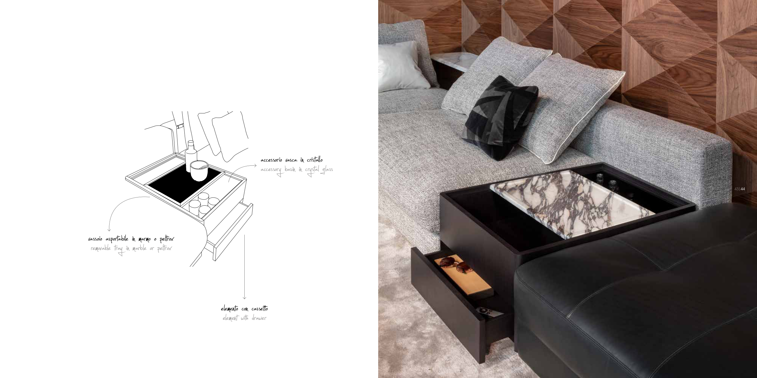 vassoio asportabile in marmo o peltrox removable tray in marble or peltrox elemento con cassetto element with drawer accessorio vasca in cristallo accessory basin in crystal glass |44 43