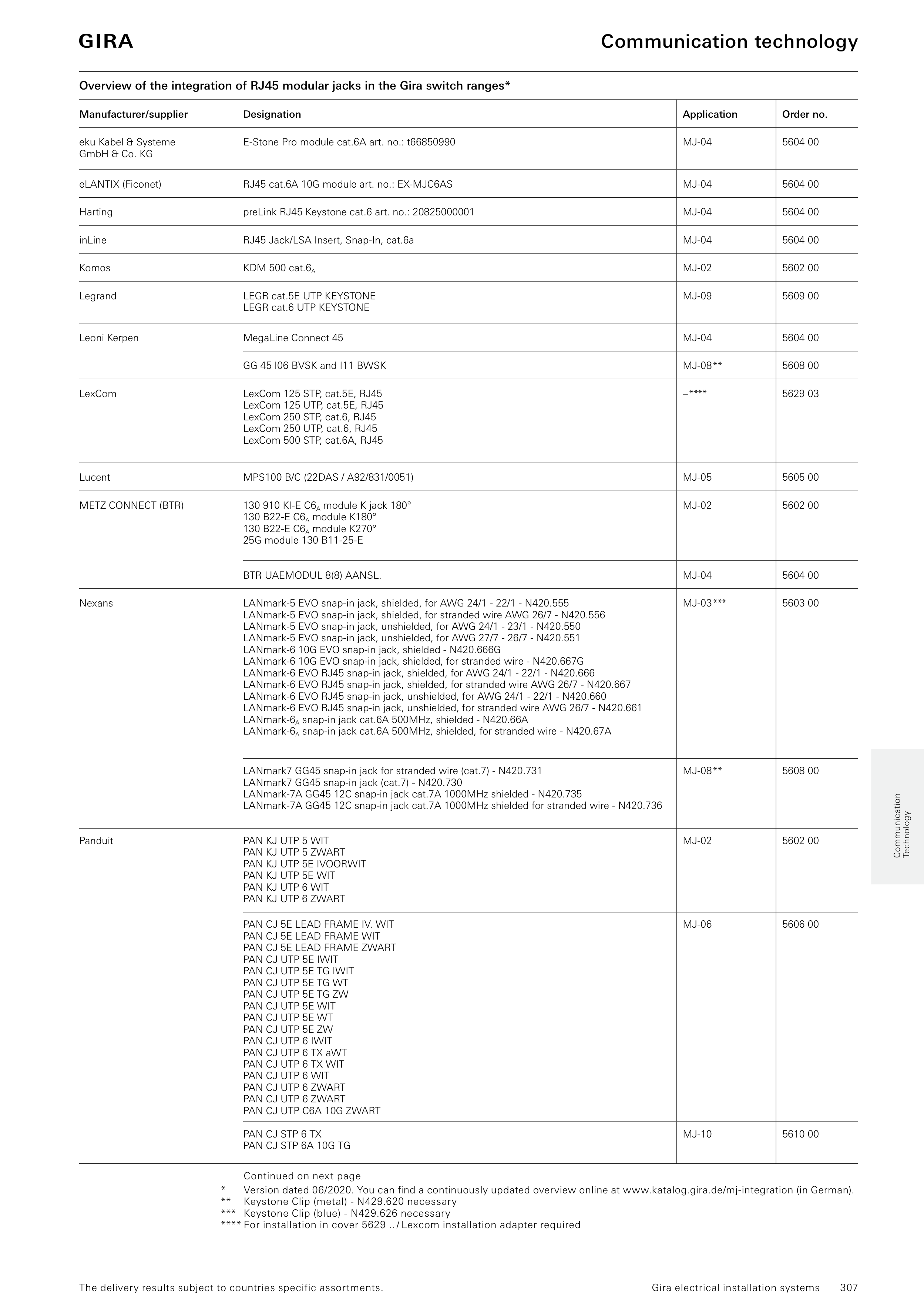 Version dated 06/2020. You can find a continuously updated overview online at www.katalog.gira.de/mj-integration (in German).