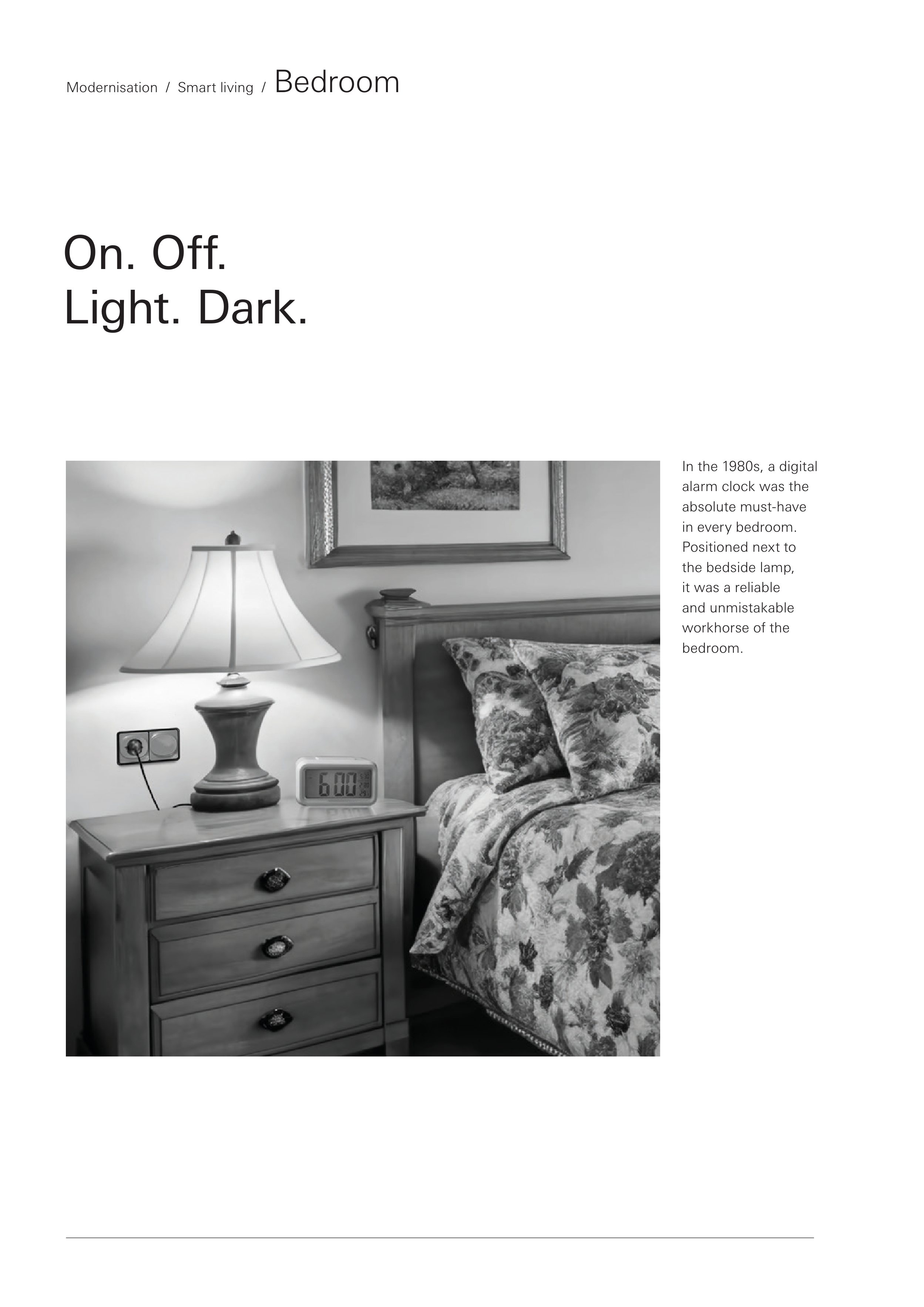 In the 1980s, a digital alarm clock was the absolute must-have in every bedroom. Positioned next to the bedside lamp, it was a reliable and unmistakable workhorse of the bedroom. On. Off. Light. Dark. Modernisation / Smart living / Bedroom