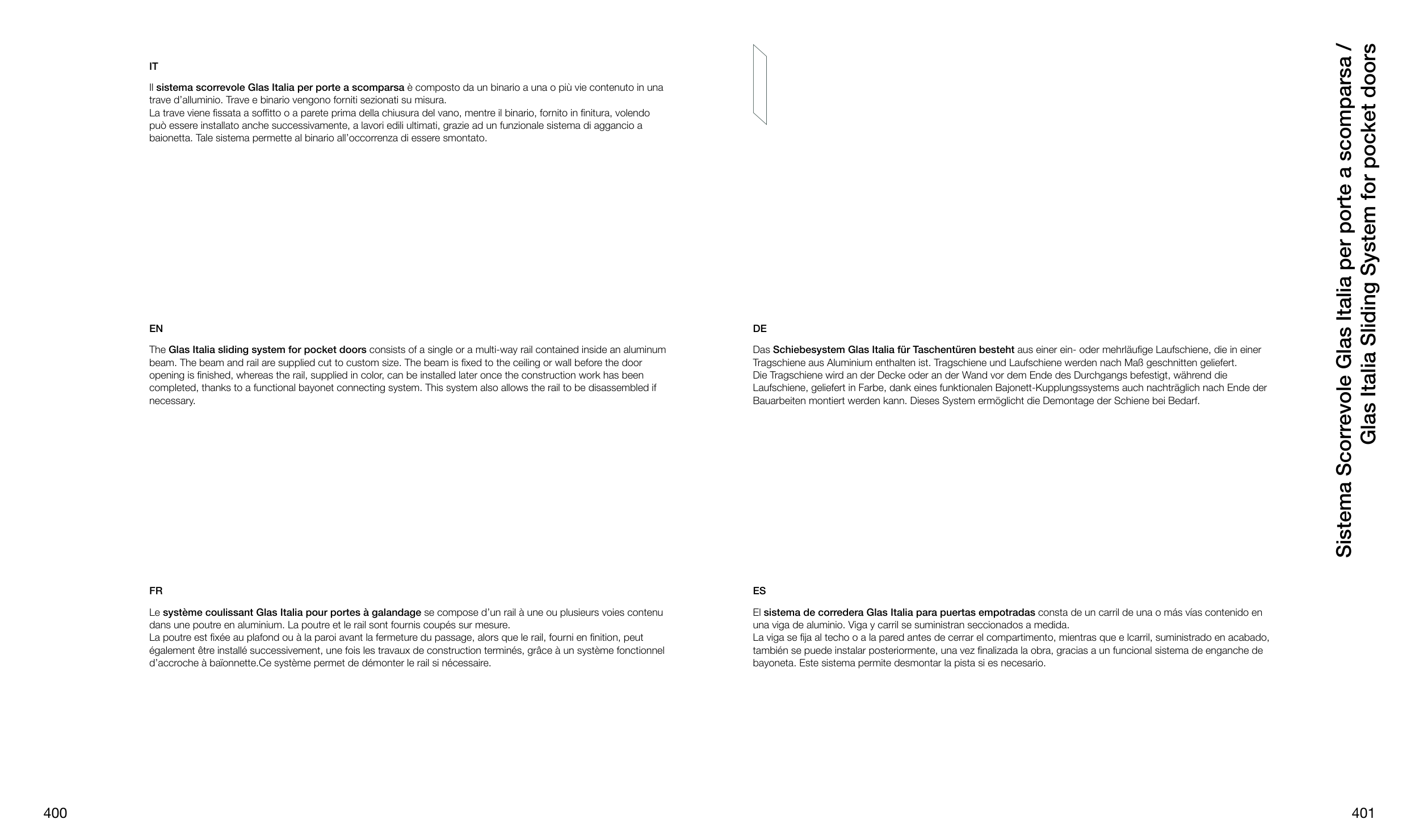 El sistema de corredera Glas Italia para puertas empotradas consta de un carril de una o más vías contenido en