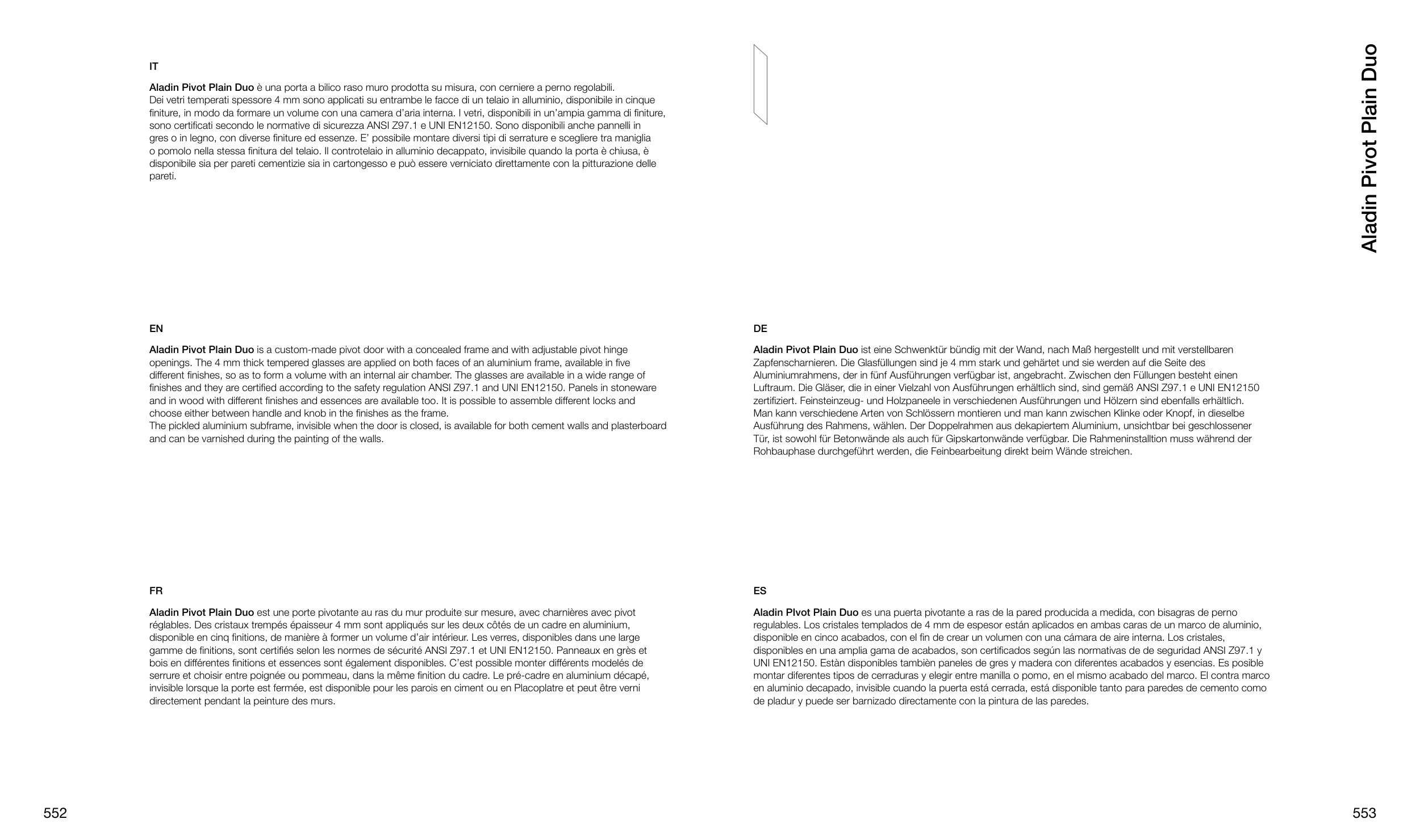 Aladin Pivot Plain Duo è una porta a bilico raso muro prodotta su misura, con cerniere a perno regolabili.