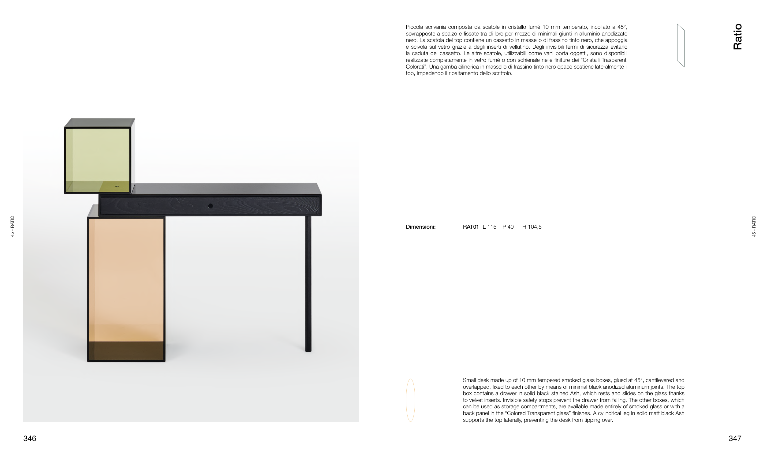 back panel in the “Colored Transparent glass” finishes. A cylindrical leg in solid matt black Ash