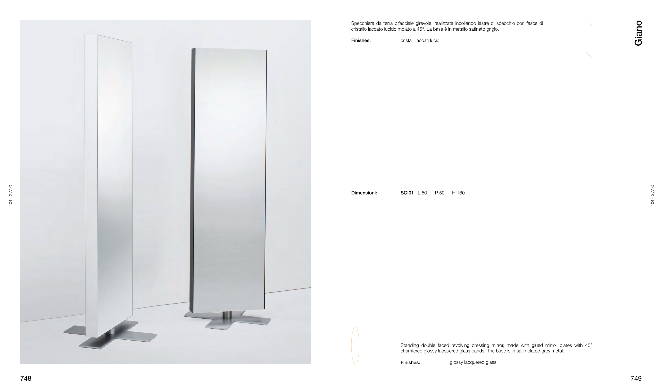 cristallo laccato lucido molato a 45°. La base è in metallo satinato grigio.