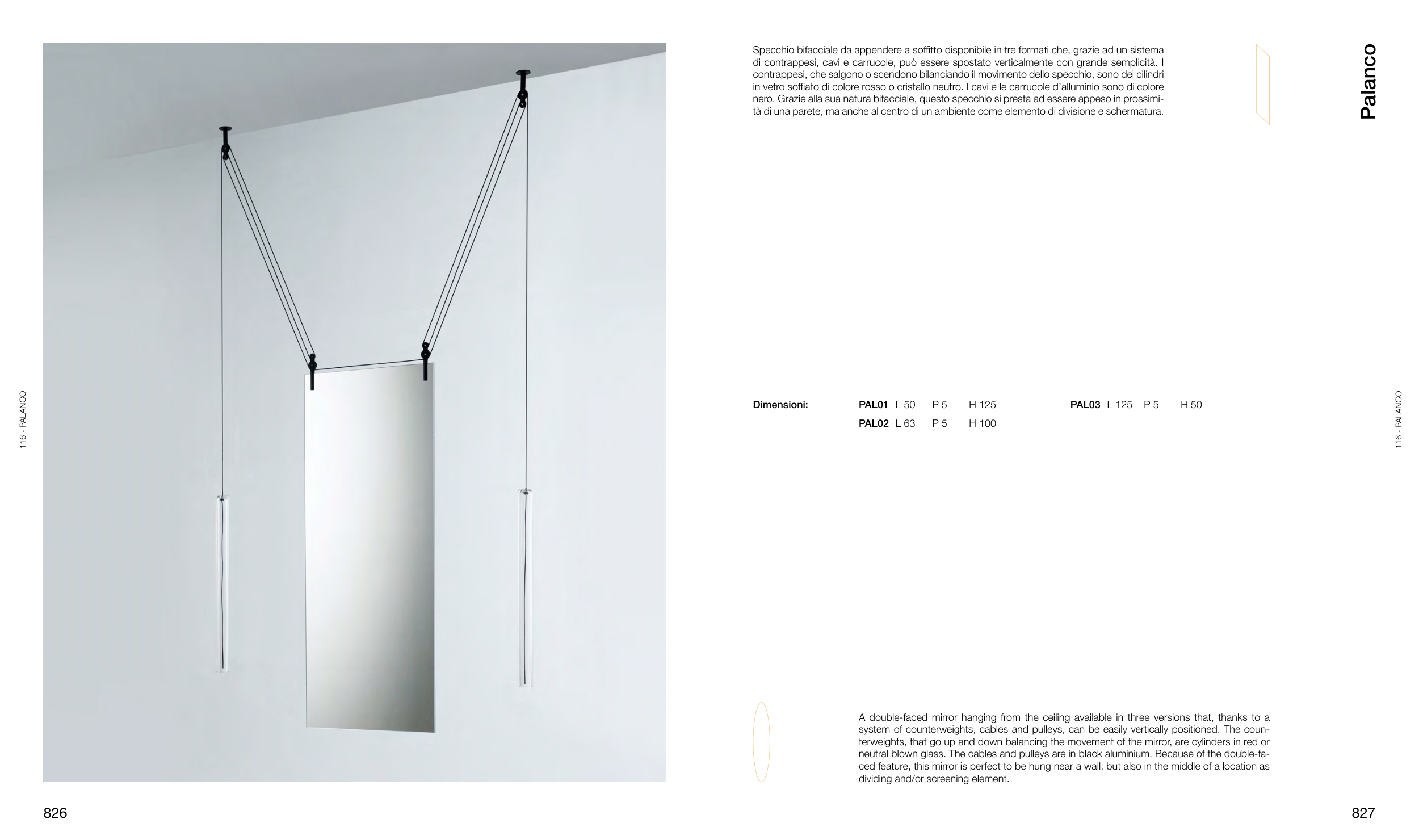 A double-faced mirror hanging from the ceiling available in three versions that, thanks to a