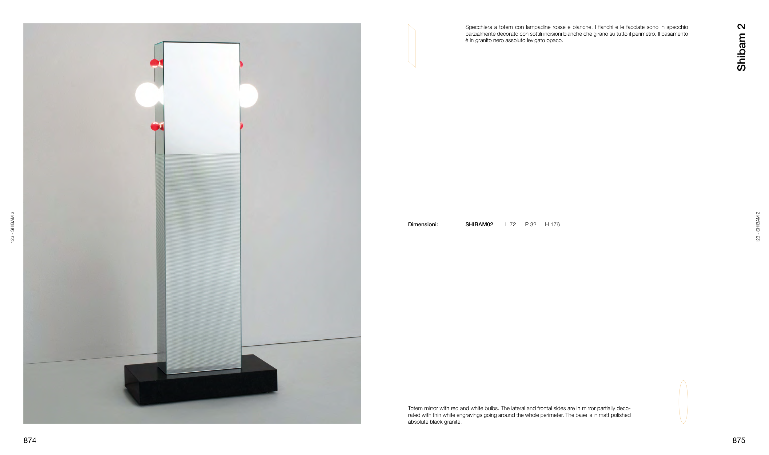 Totem mirror with red and white bulbs. The lateral and frontal sides are in mirror partially deco-
