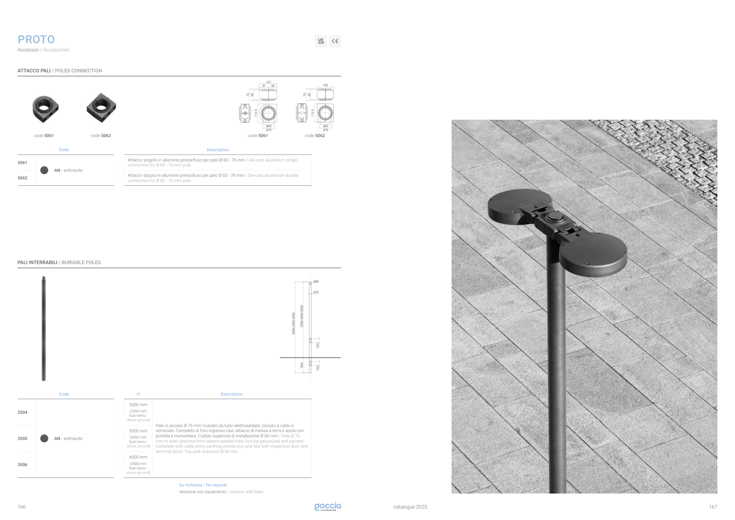 portella e morsettiera. Codolo superiore di installazione Ø 60 mm / Pole Ø 76